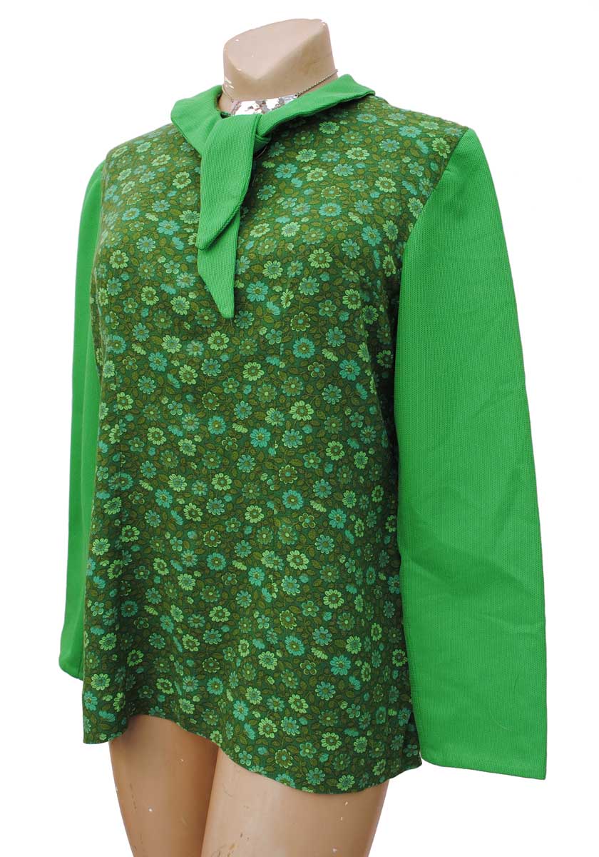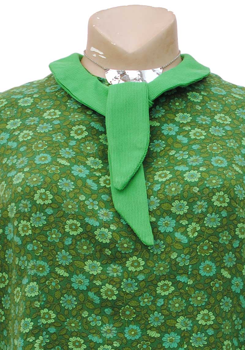 Cute little women's vintage 60s green long sleeve micro mini dress, or tunic top in green ditsy floral cotton with long sleeves. Hand Made with a pussy bow tie at the collar.