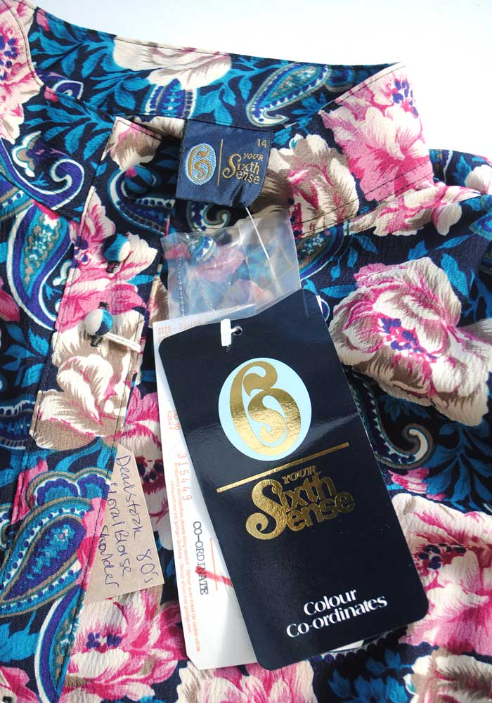 Women's Vintage 1970s Deadstock Sixth Sense pink floral and turquoise blouse with high neck collar, gathered padded shoulders, hidden buttons and a cheerful colourful floral print. Unworn still with attached tags from Sixth Sense C & A. Long sleeves fastening tight at the wrists. So typical 80s.