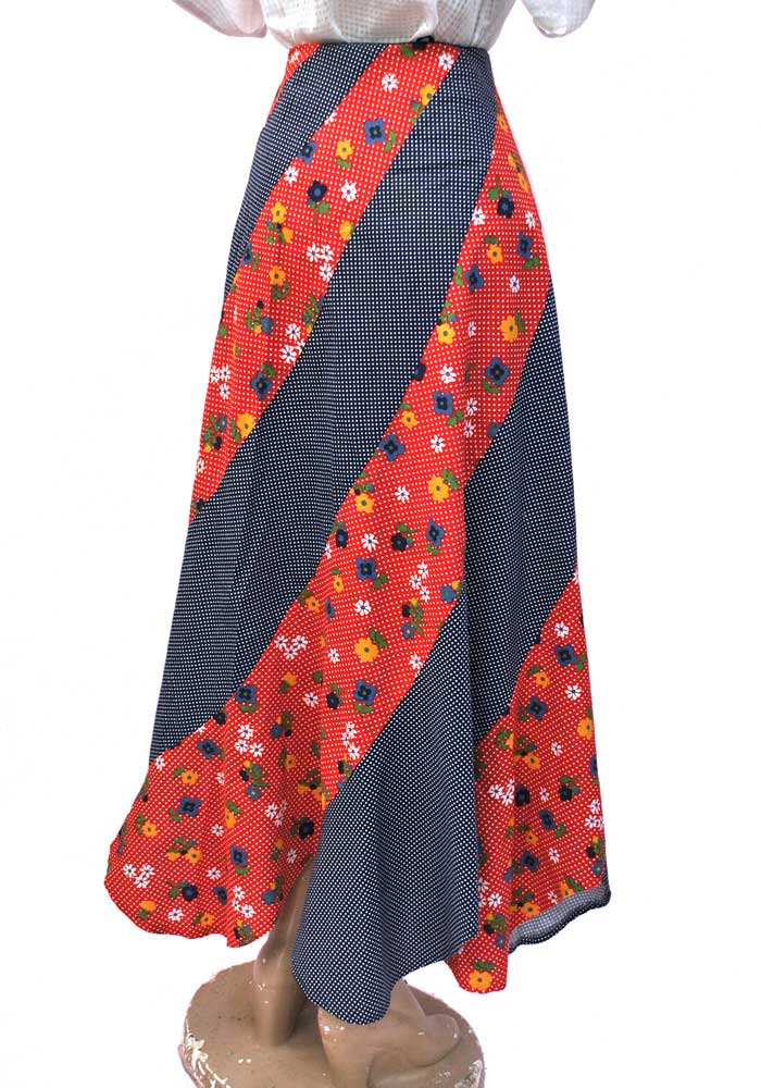 1970s Vintage Red and Blue Patchwork Floral Maxi Skirt • Scarf Hem • Polka Dots