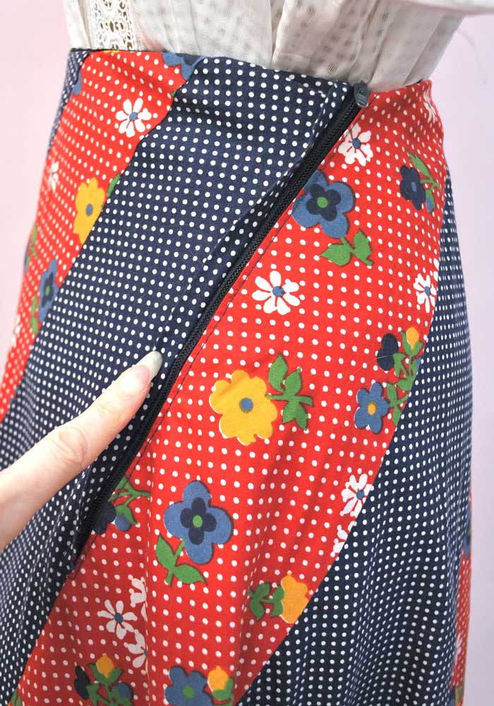 Pretty 1970s maxi skirt made with curved panels of red floral and navy blue polka dot cotton, finished with a scalloped scarf hem line.