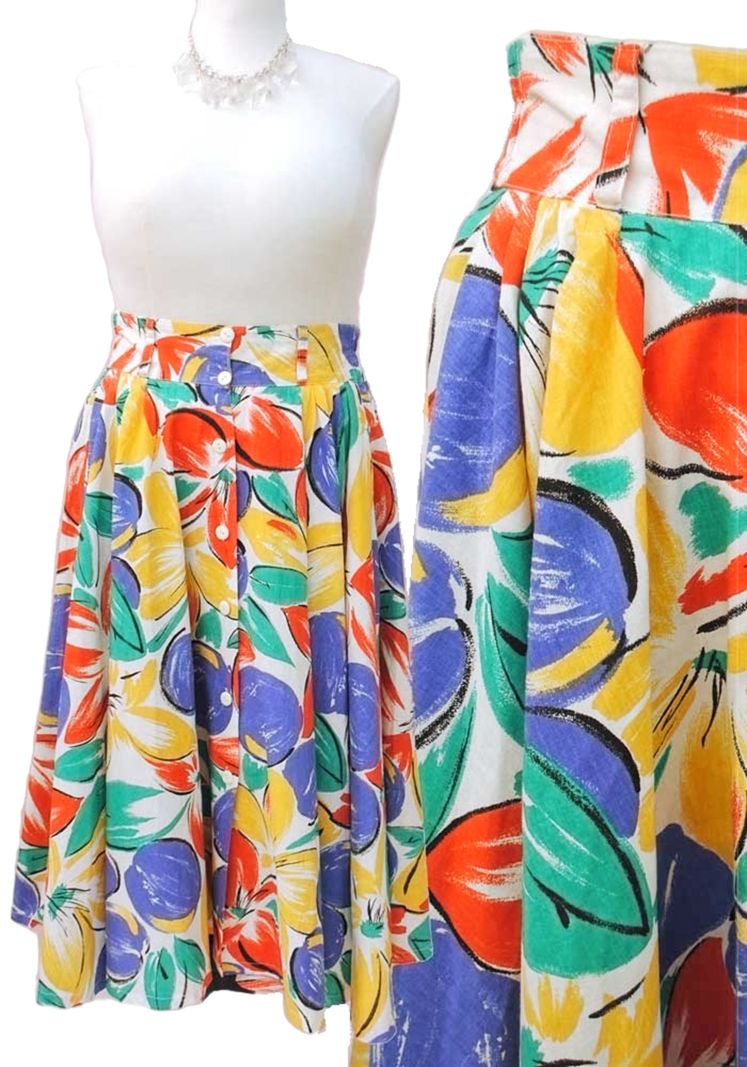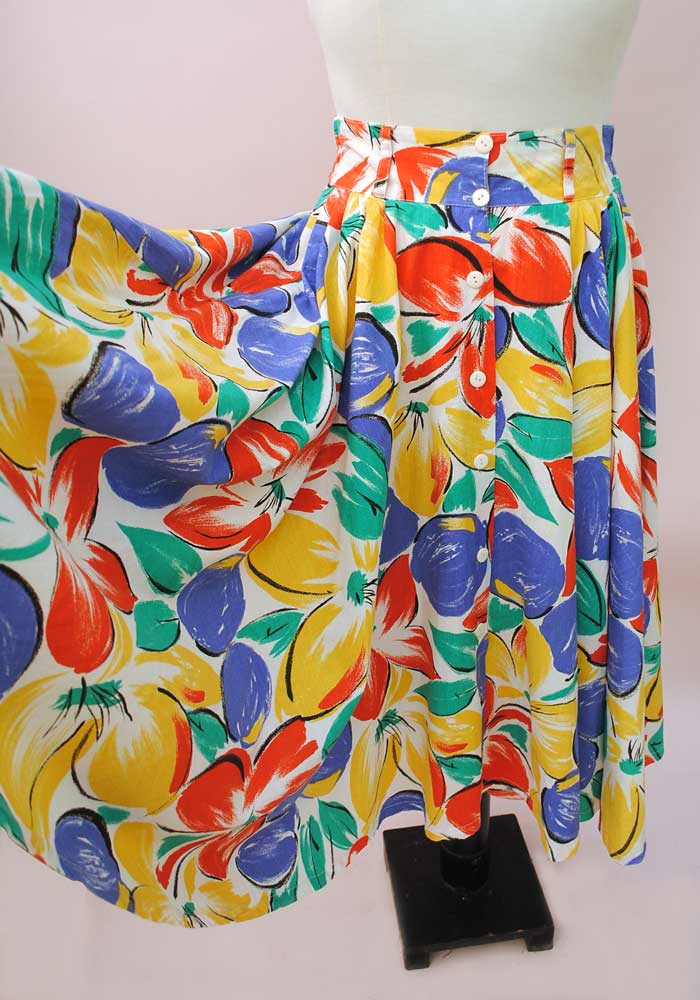 Fab striking full circle skirt from the 80s, with colourful oversized floral print in dynamic colours. It has a wide waist band, part elasticated and opens all the way down the front with white plastic buttons. And - tah dah, it's got pockets, one on each side. This skirt screams Summer, it's so joyous.