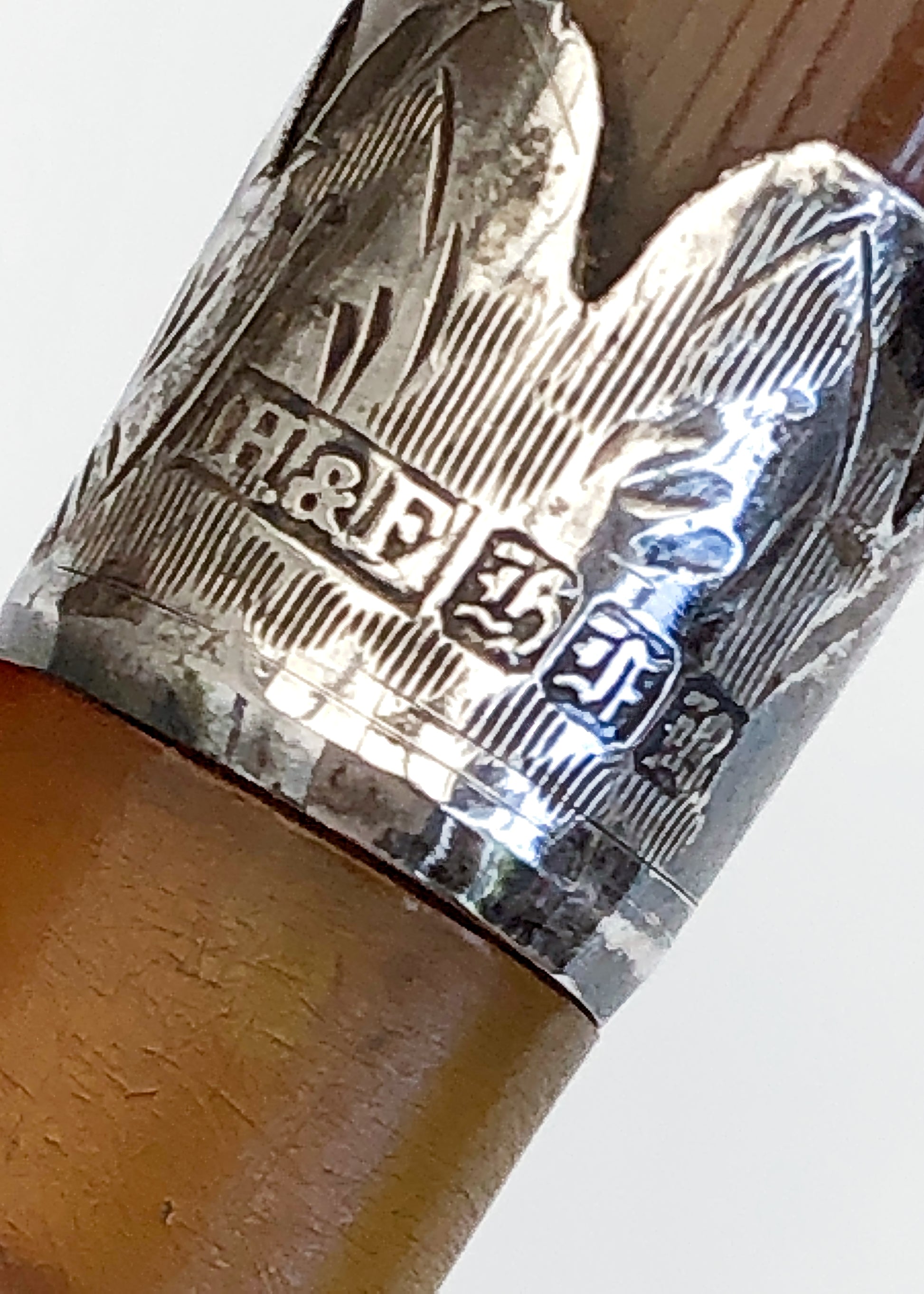 An antique Edwardian British silver cheroot (cigarillo) holder made by Hall & Fitzgerald of Birmingham. An attractive silver collar with hall marks; "H&F" stands for Hall & Fitzgerald, a silversmith partnership listed at 147 Temple Street, Bristol, and active between 1902 and 1913 for items like cheroot holders.