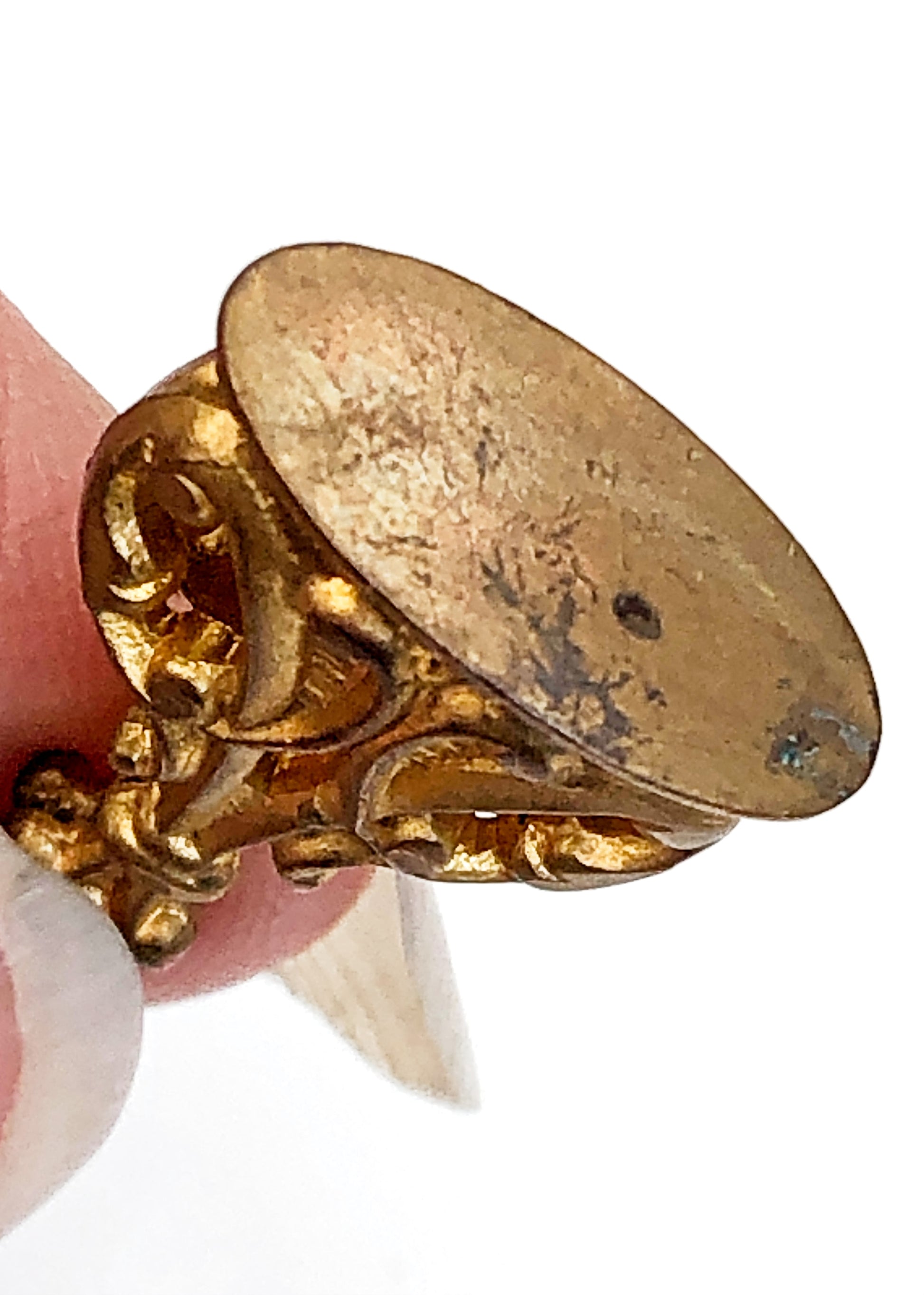 It is brass or gilt metaland not real gold.  These can also be worn as a mourning ribbon fob and worn clipped at the waist. Think back to the TV show Victoria, Albert wore one. As you can see it is incomplete. I'm unsure if the fob should attach to the ribbon or the chain. Either way, I'll be selling as is - so whomever buys it can assemble it how they wish.