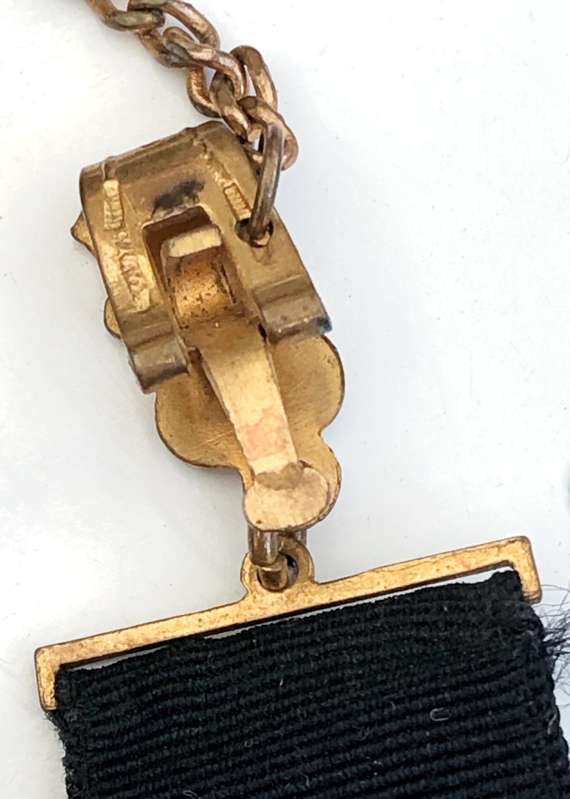 • In worn dismembered condition, The black grosgrain ribbon is original, with light fraying consistent with age, the metal is worn with pitting, pieces not attached as shown in photos.