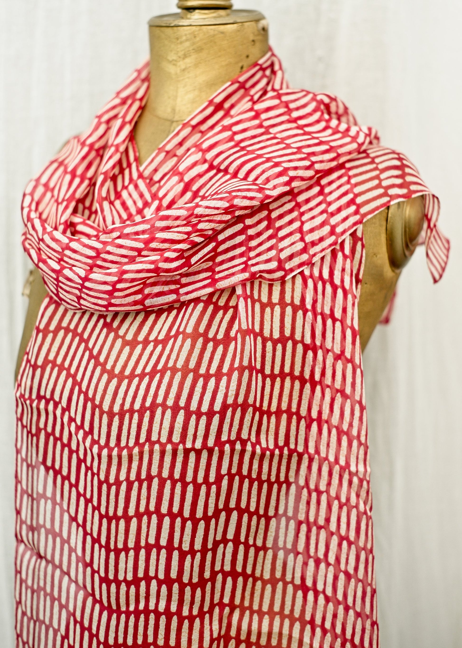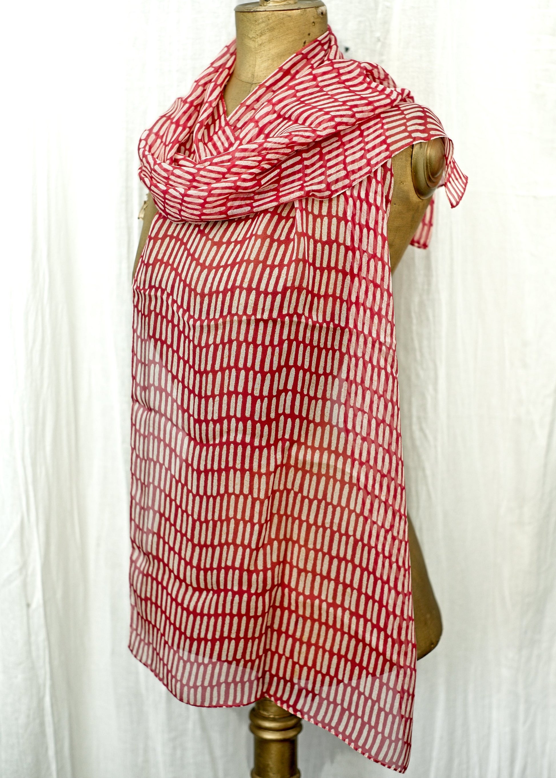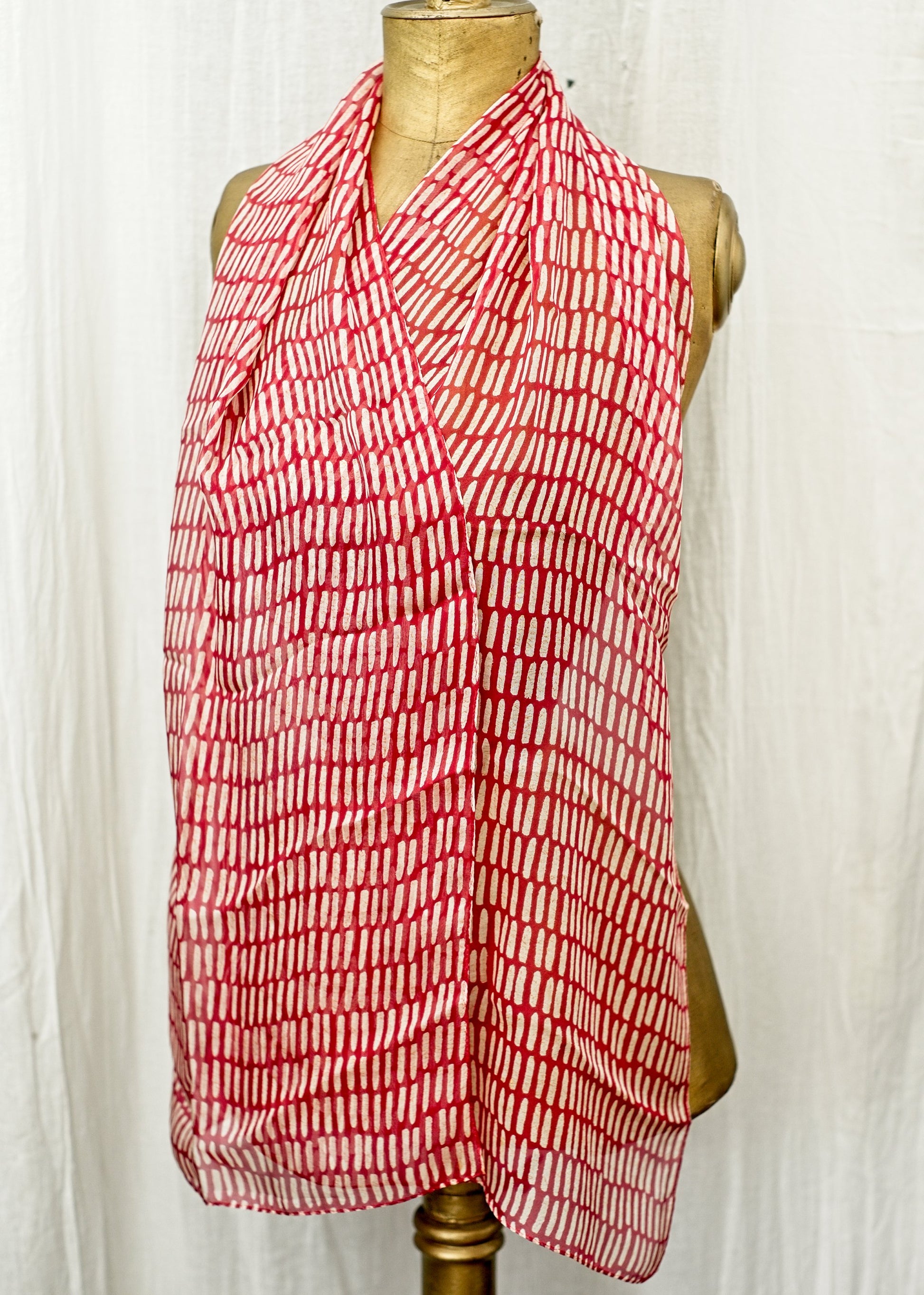 Women's 90s vintage red and white sheer, long tissue silk chiffon scarf in a red and white geometric pattern. So soft to touch you can barely feel it. It drapes beautifully.