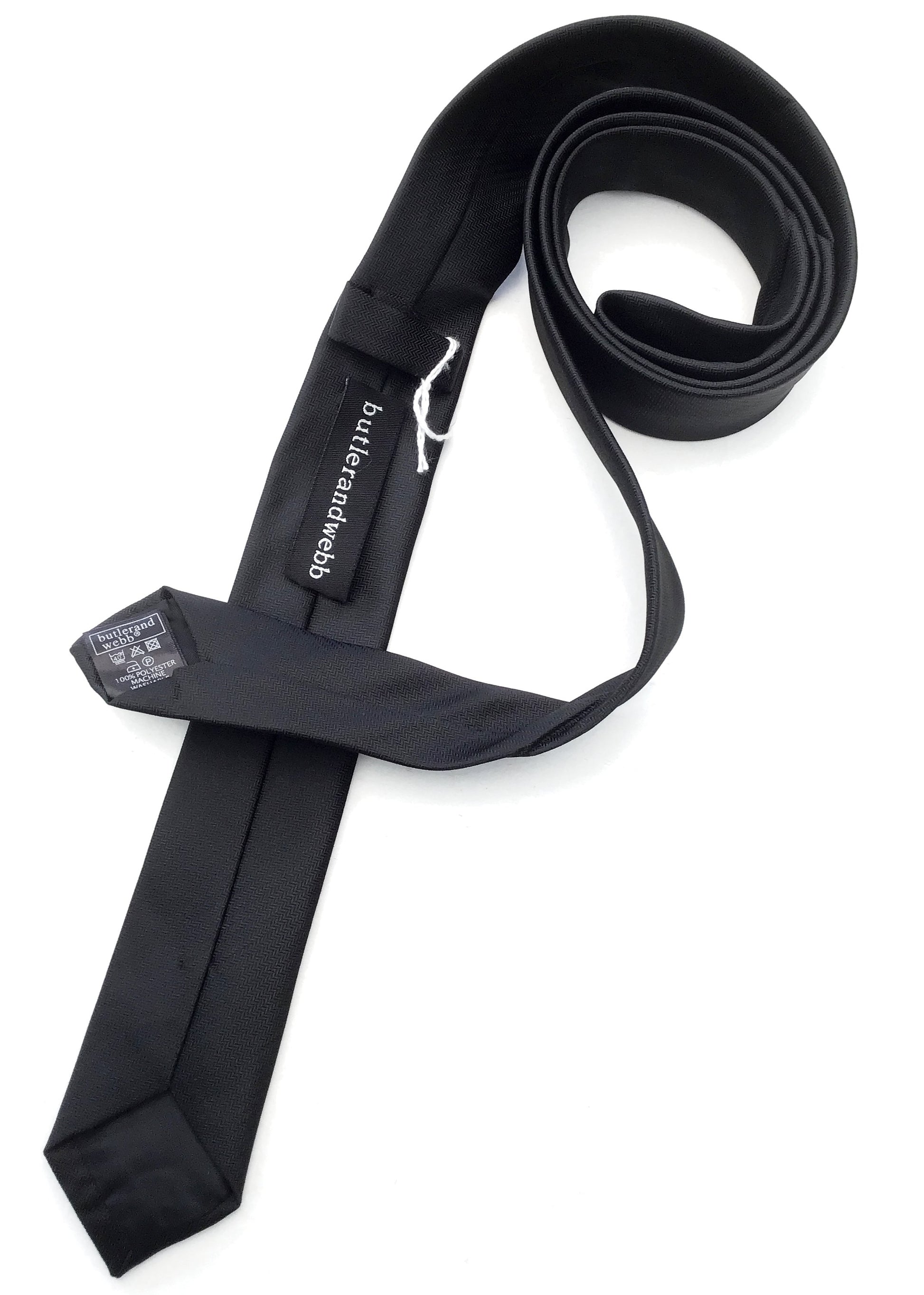 Men's vintage dapper Butler and Webb black skinny neck tie. The design features tiny black herringbone pattern in the weave. Just as every woman needs a classic little blck dress in her wardrobe, every man needs a classic black tie as a wardrobe staple.