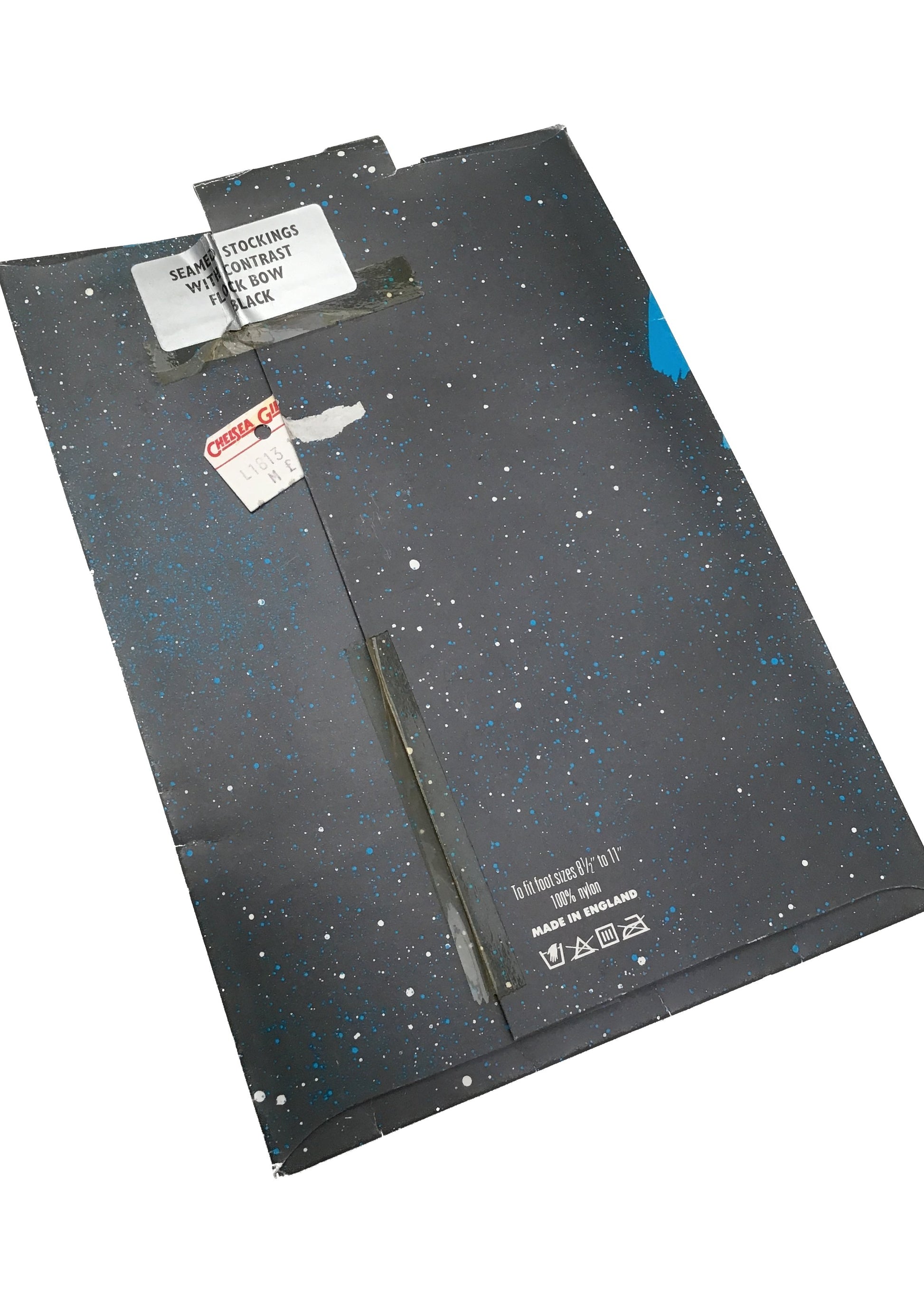Vintage 70s deadstock Chelsea Girl. Black Nylon seamed stockings with a flock bow design on the heel, in original packaging.