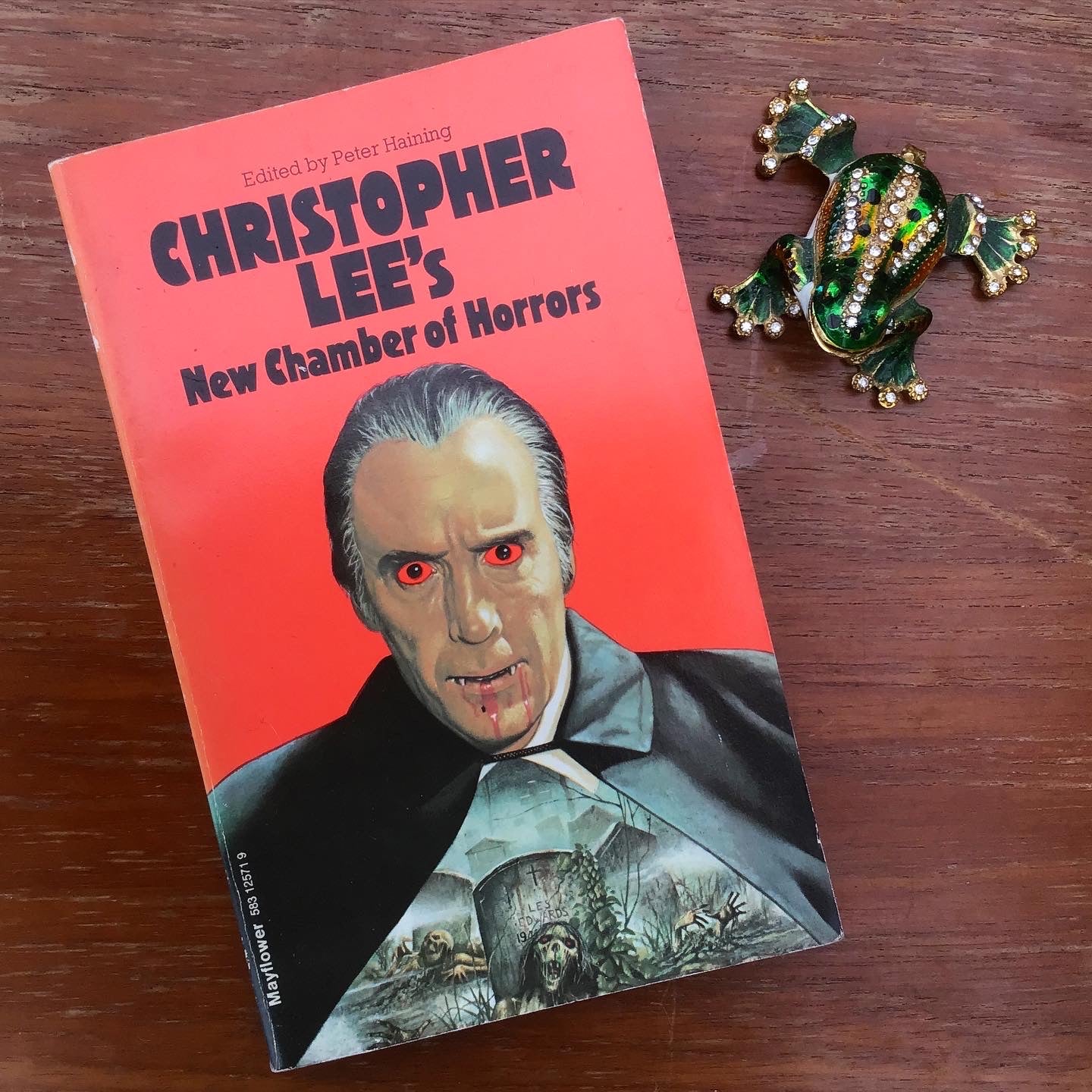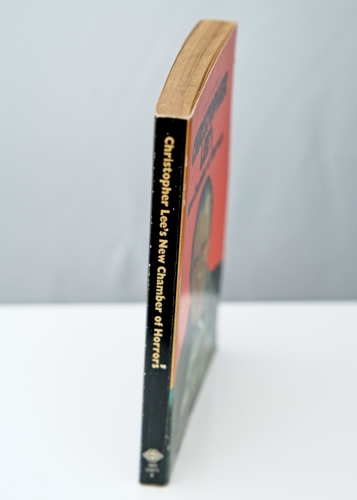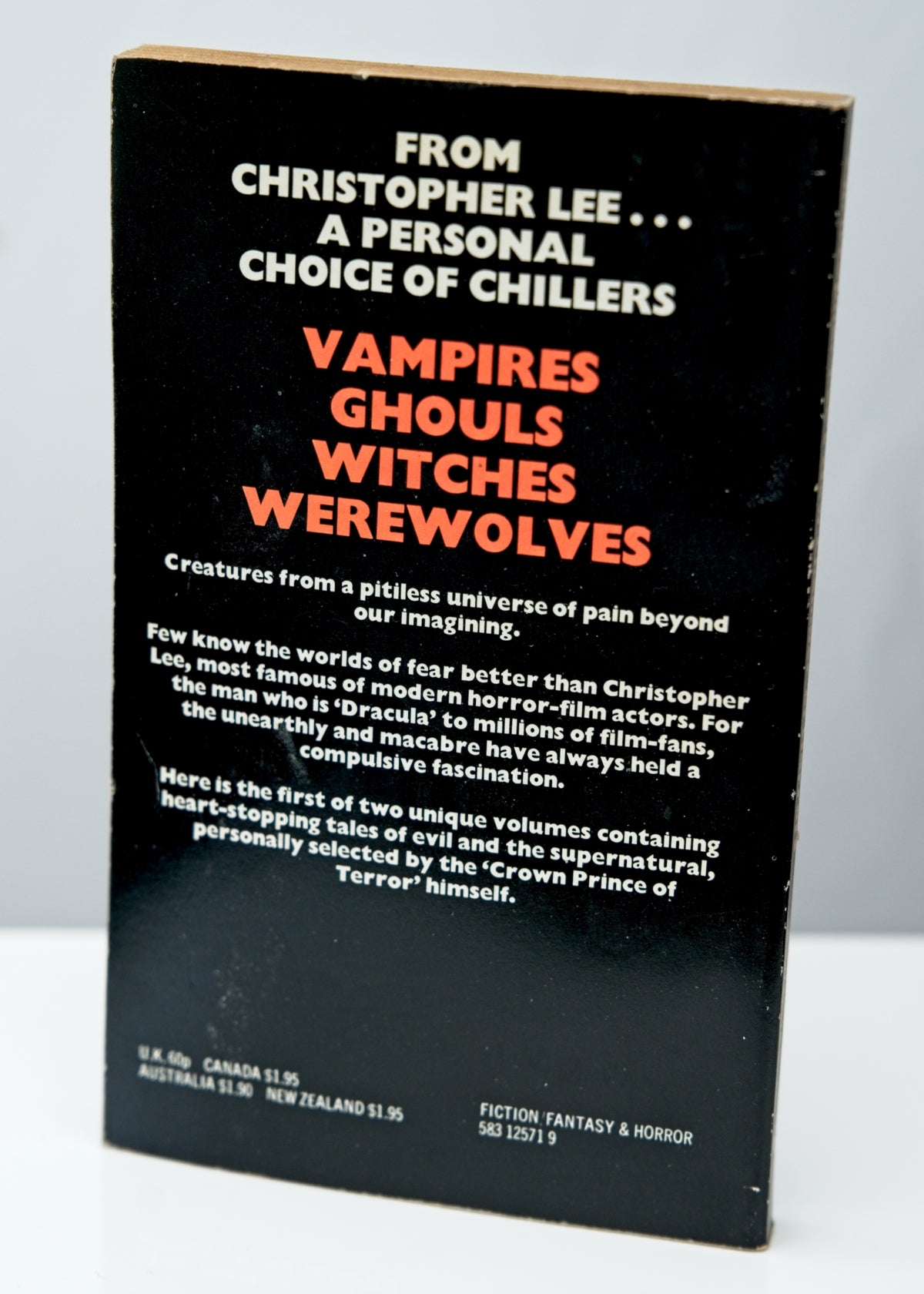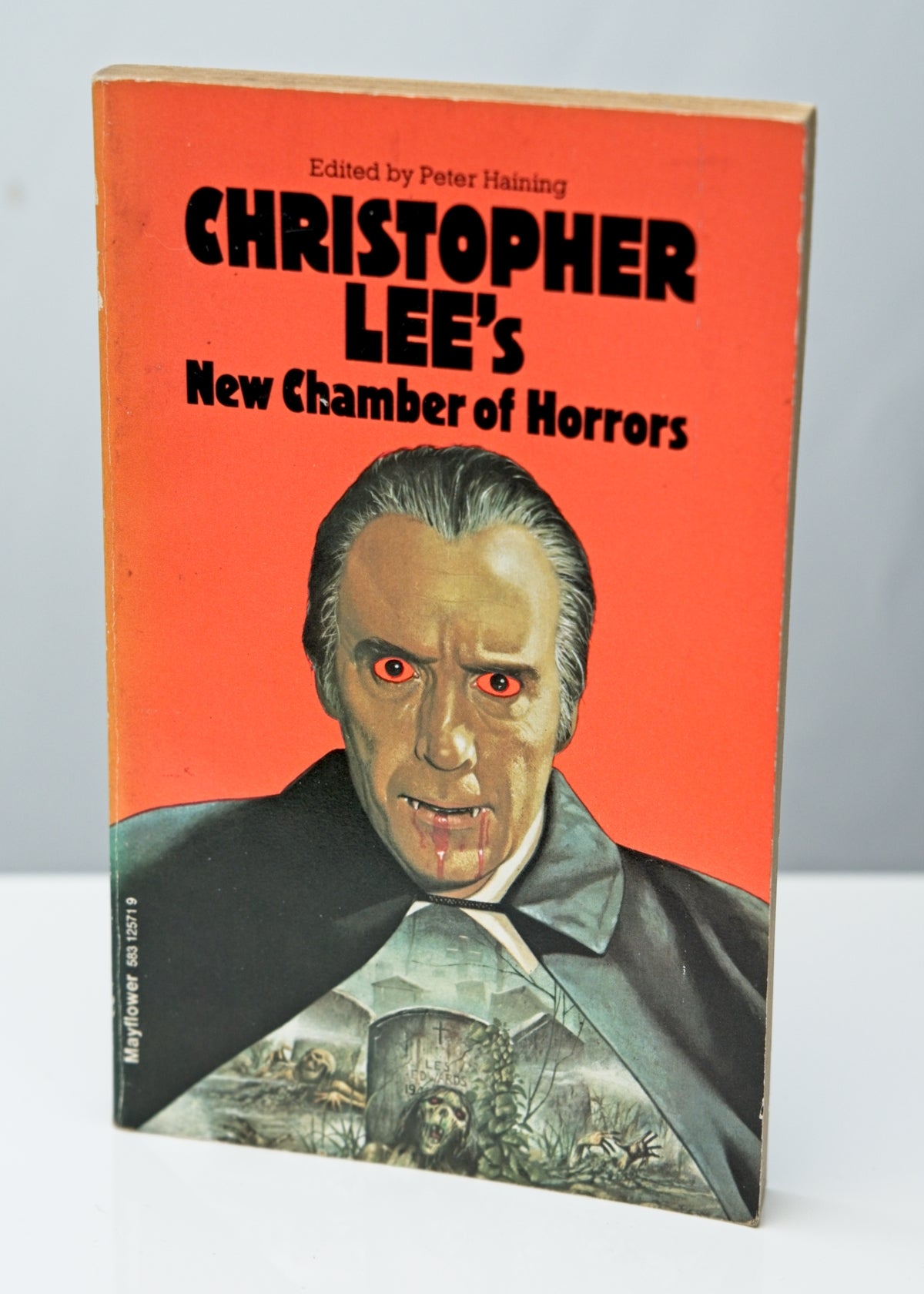 Used paperback horror book with a fab lurid orange printed cover featuring Christopher Lee.