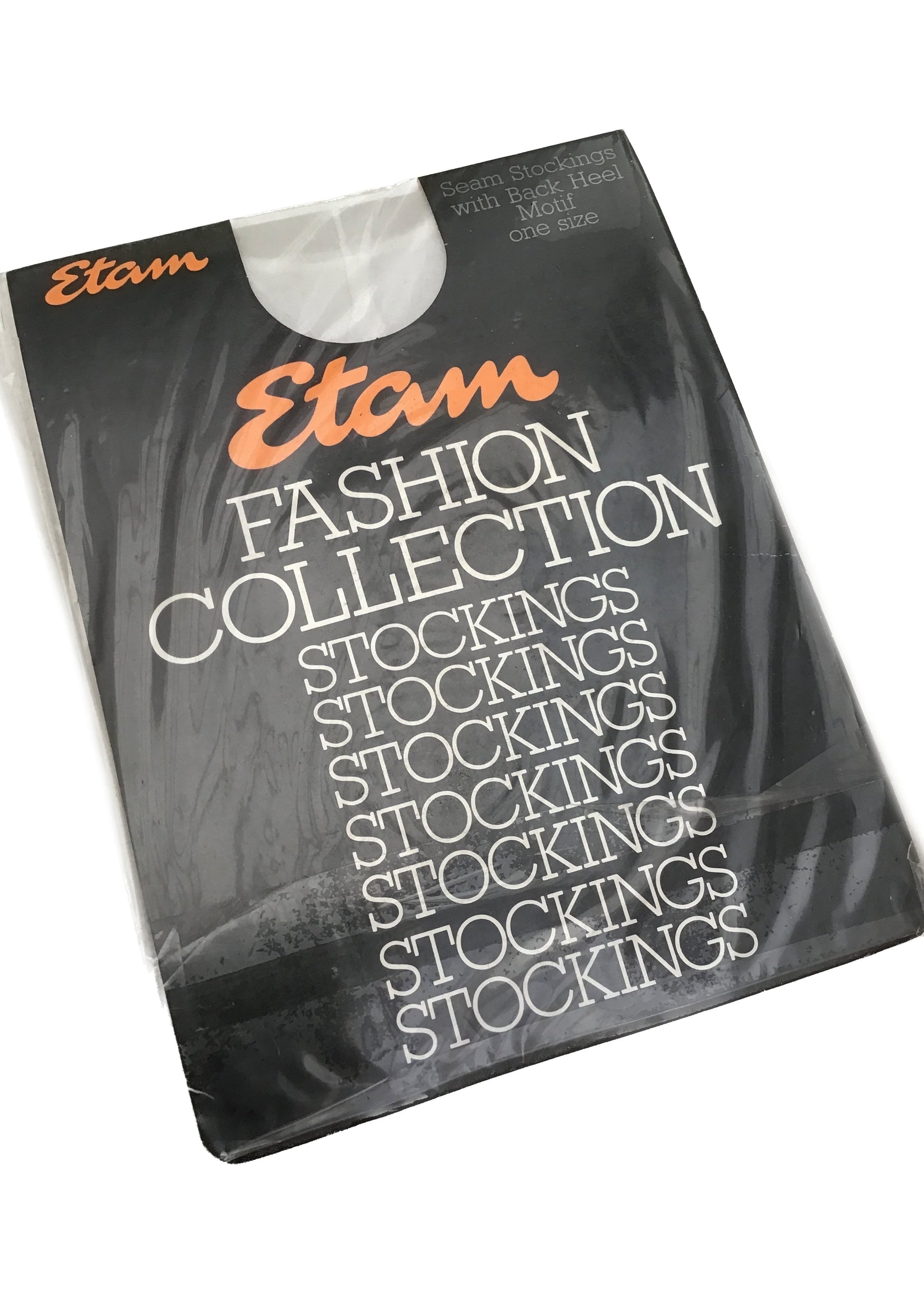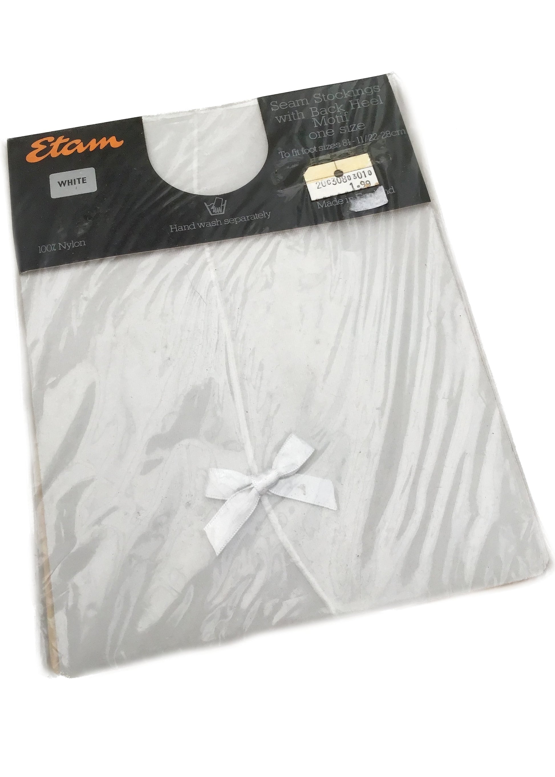 Vintage 80s deadstock Etam White Nylon fishnet stockings with back seams and bow on the heel, in original packaging.