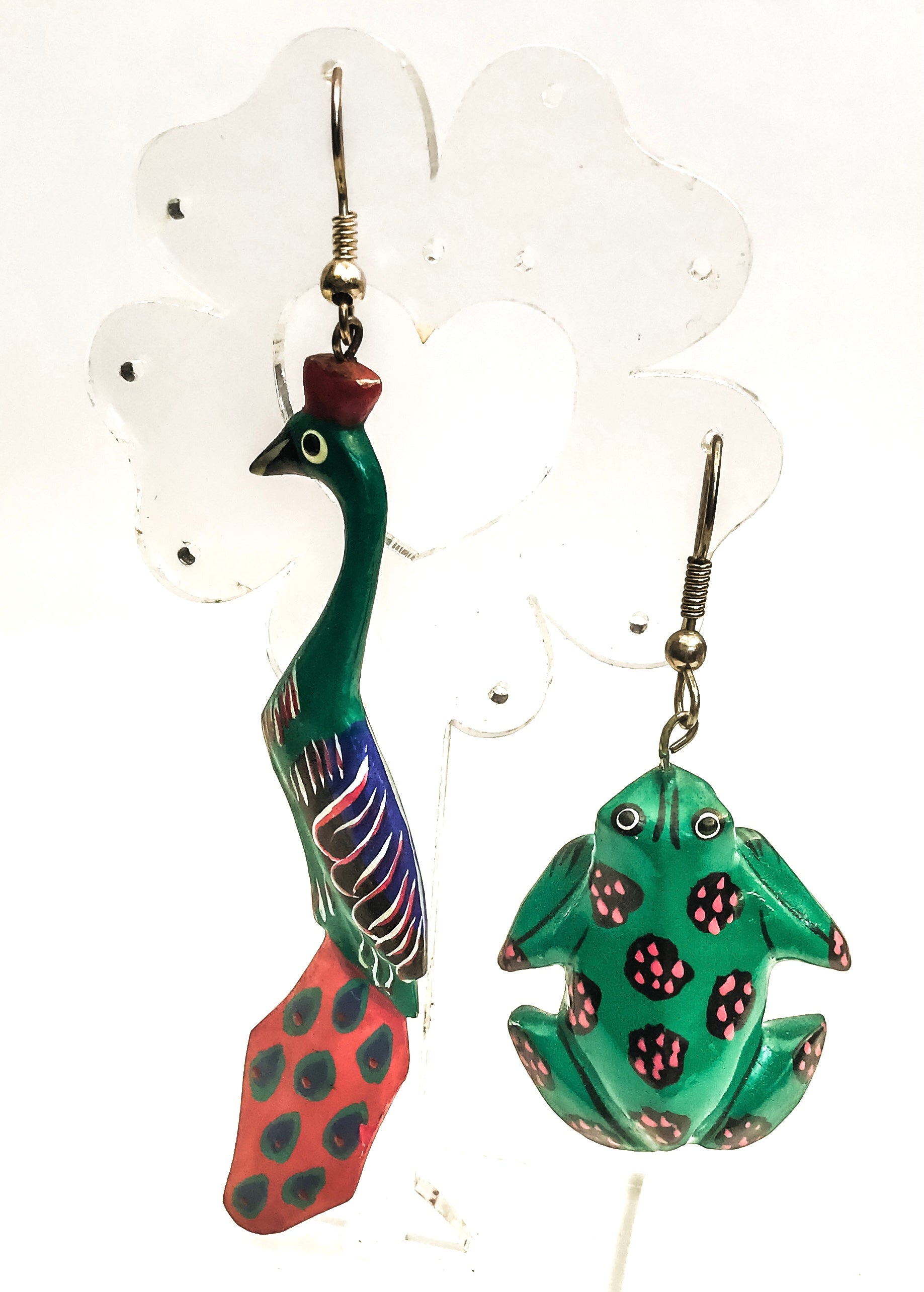 Fun novelty paper mache, hand painted odd dangle earrings from the 1980s. With a long colourful peacock and a green frog making the odd pair.