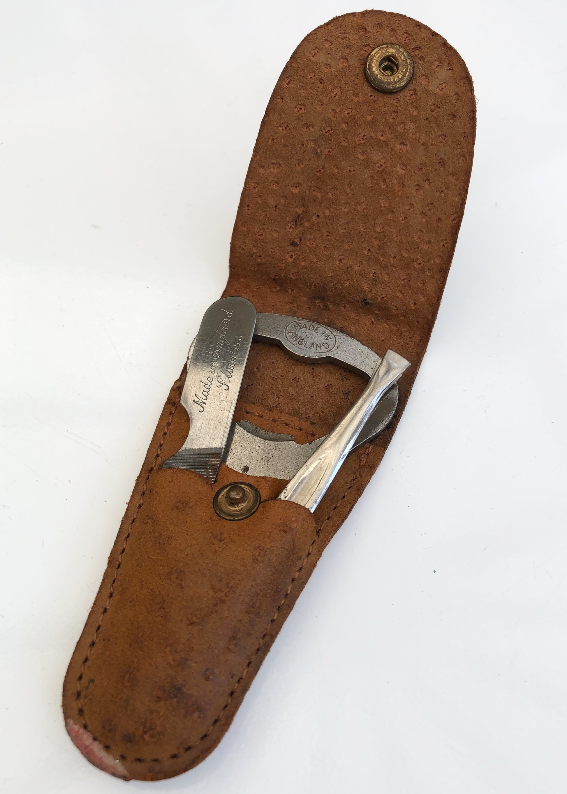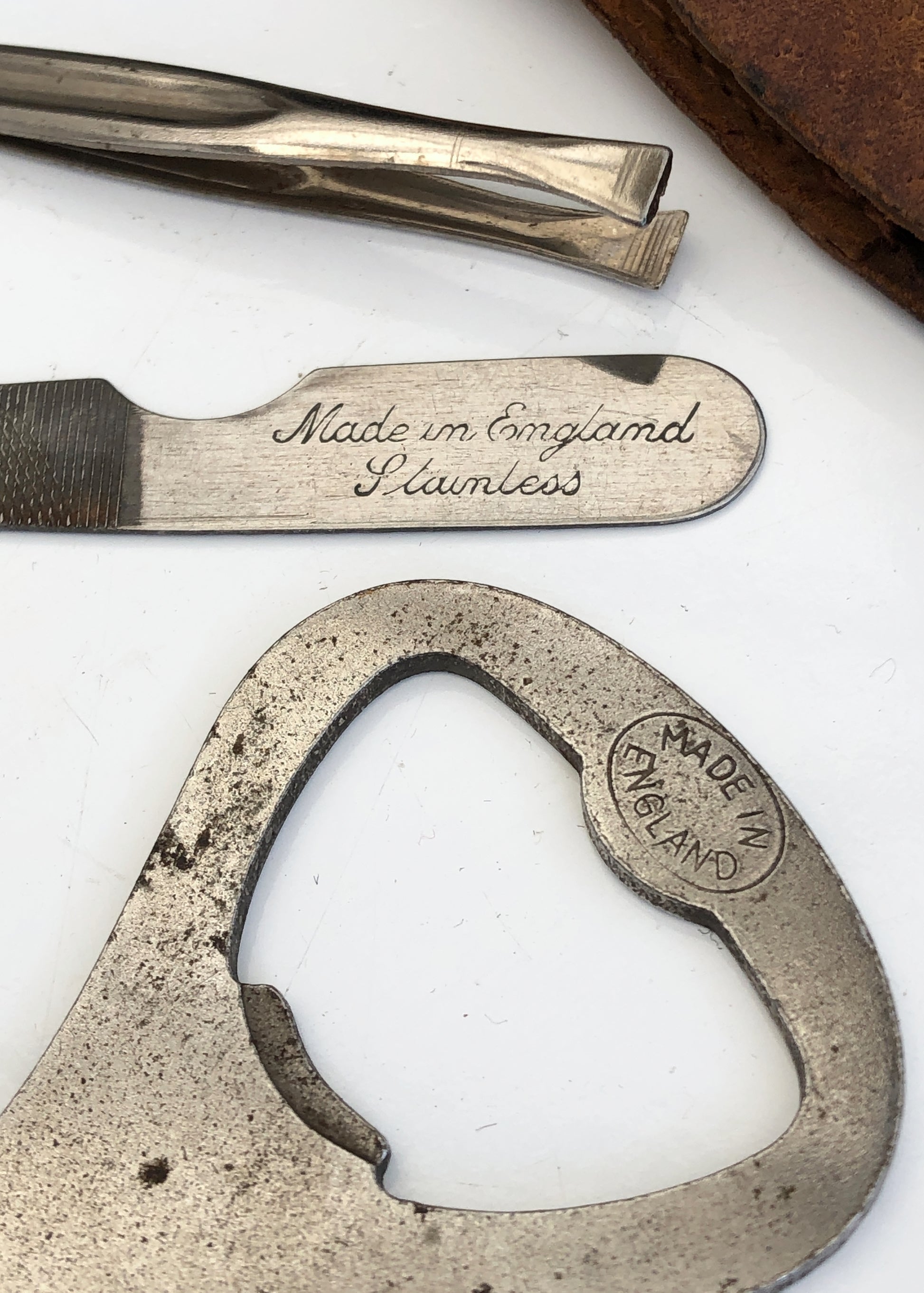 This is a vintage 40s men's travel manicure/grooming set made in England. A pig skin leather case containing a steel bottle opener, nail file and tweezers.