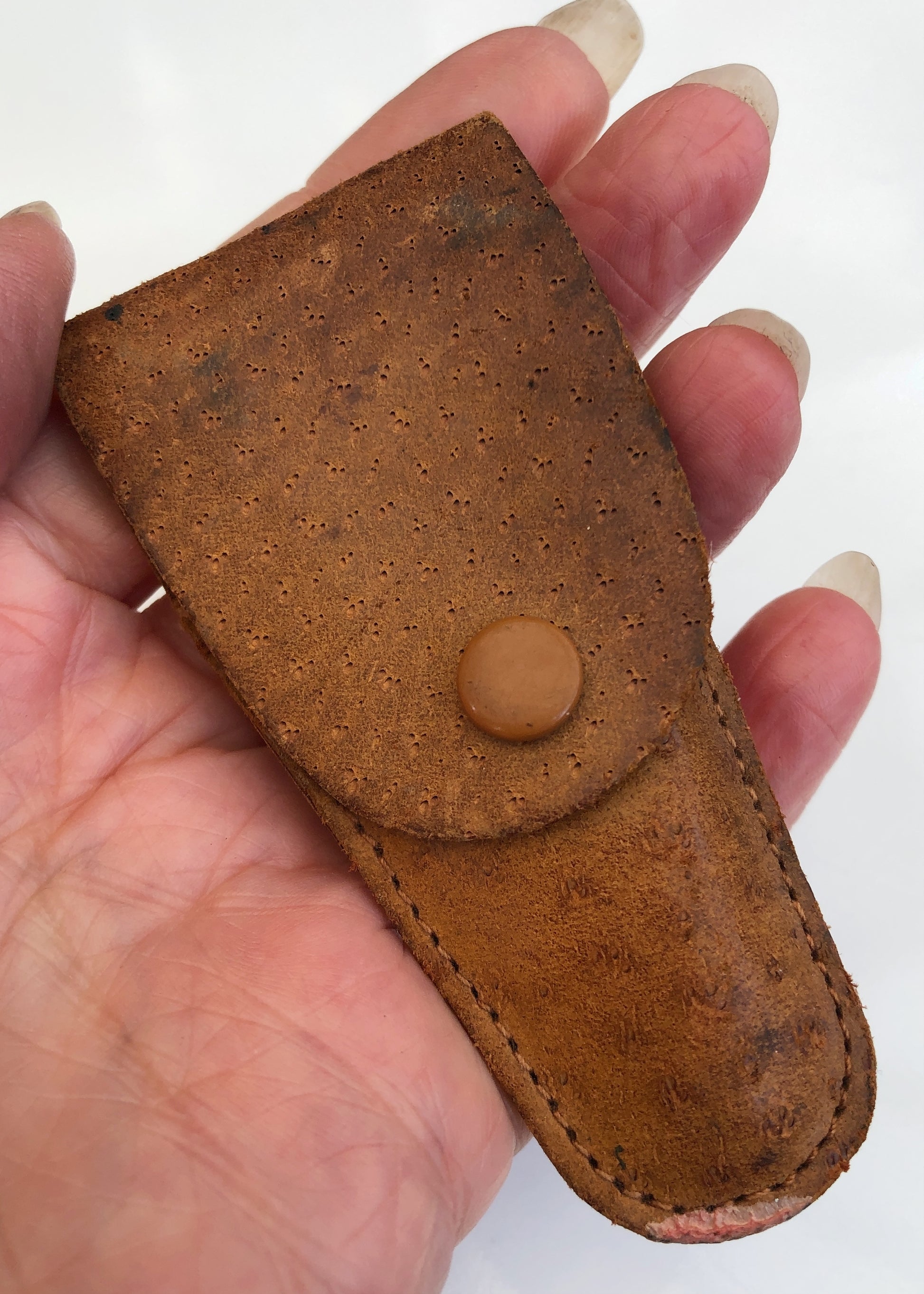 Condition - Age related pitting and scratches to the metals, the nail file has been well used with darkened file area. The leather case has darkened patches of patina and a small water mark on the bottom edge. See all images. All perfectly expected to a small kit of this age that was kept in the pocket and used every day, no doubt.