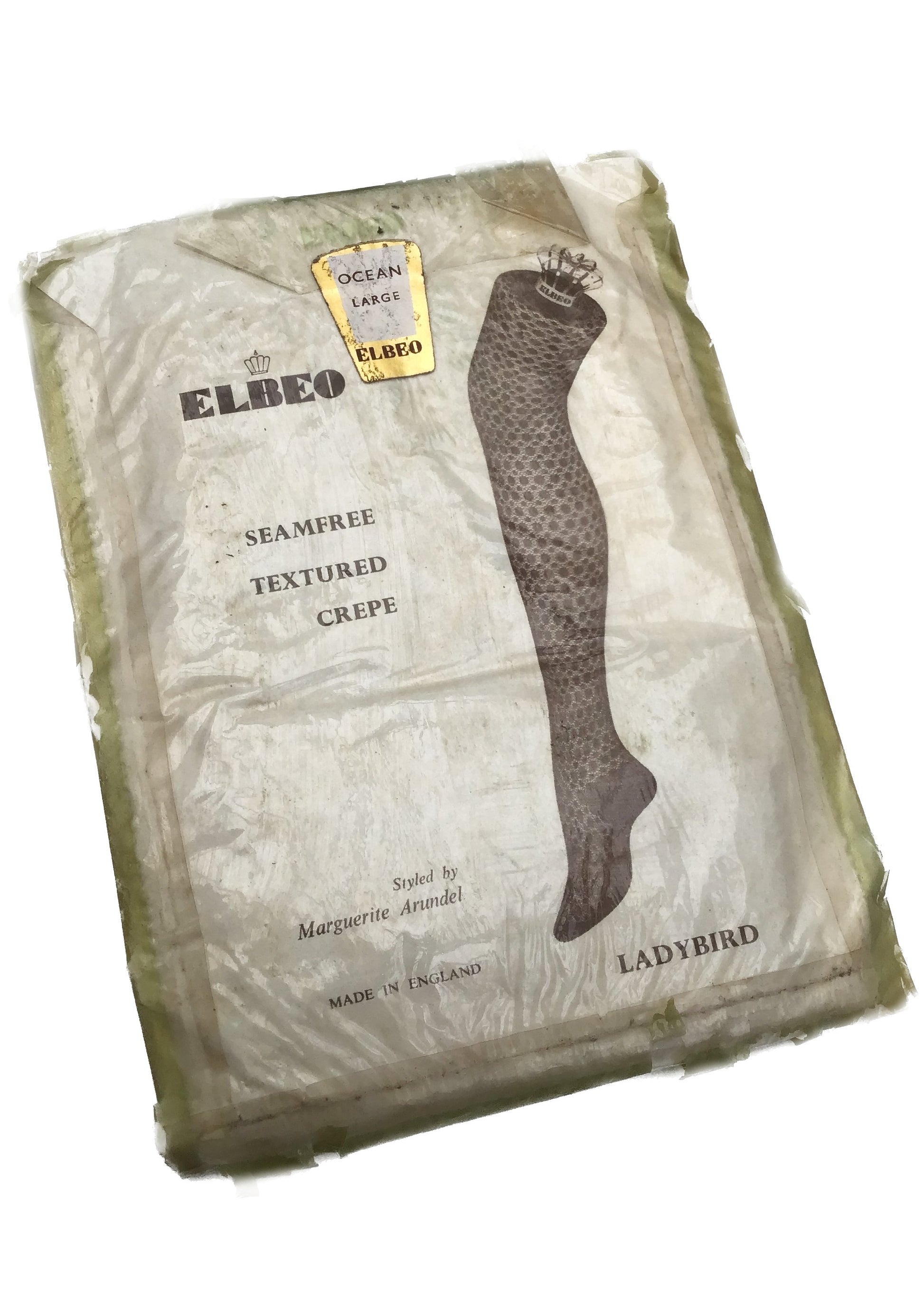 Deadstock 60s vintage Elbeo seam free stockings in a textured spotty ladybird lace pattern, Ocean blue colour, original packaging unworn.