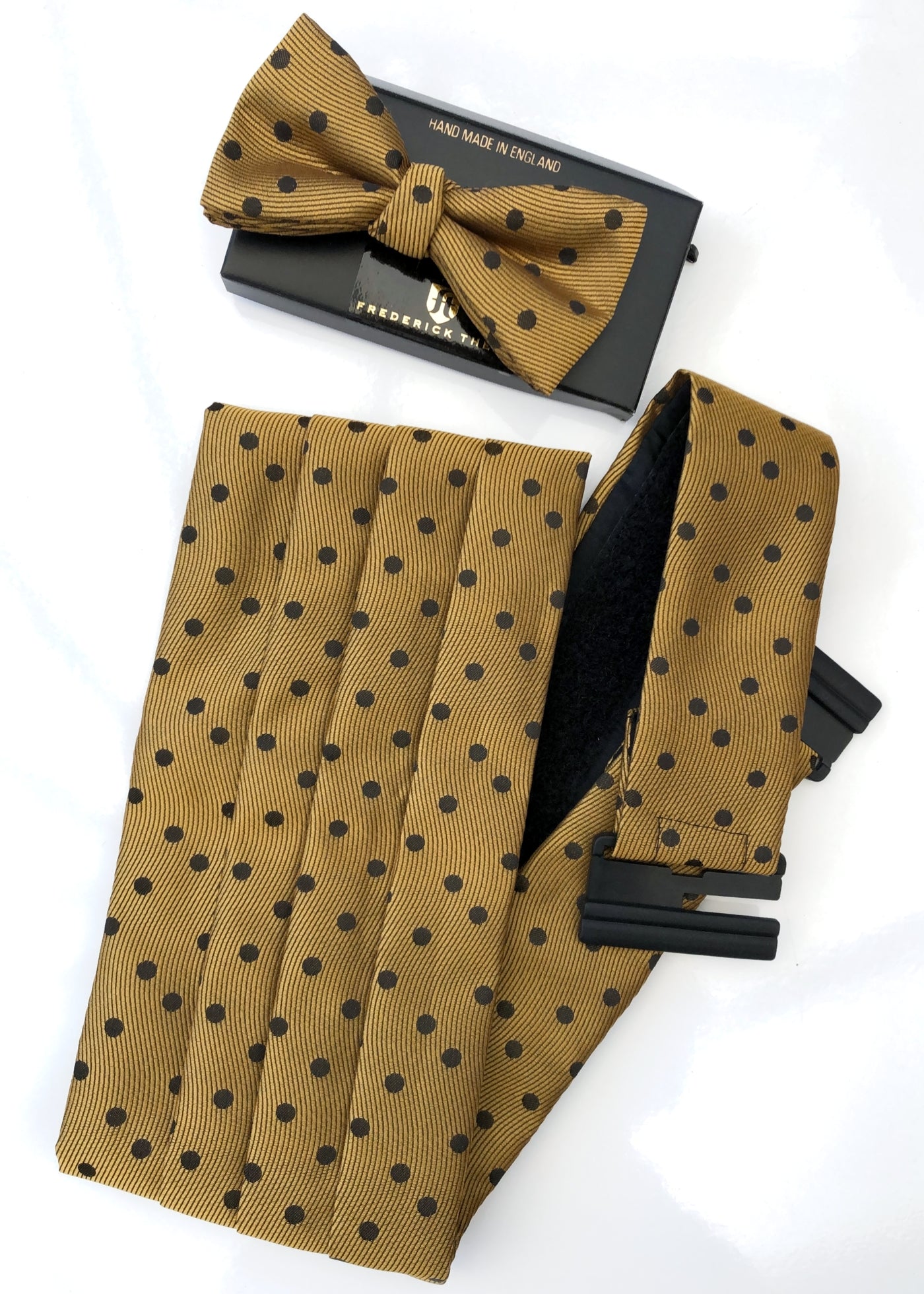 A preloved Y2K Frederick Theak bow tie and cummerbund set but appears to be unworn in original box. The colour is a muted dark gold with black polka dots. Pre tied bow tie with adjustable length, the cummerbund is also size adjustable with velcro and black plastic hook fastening.