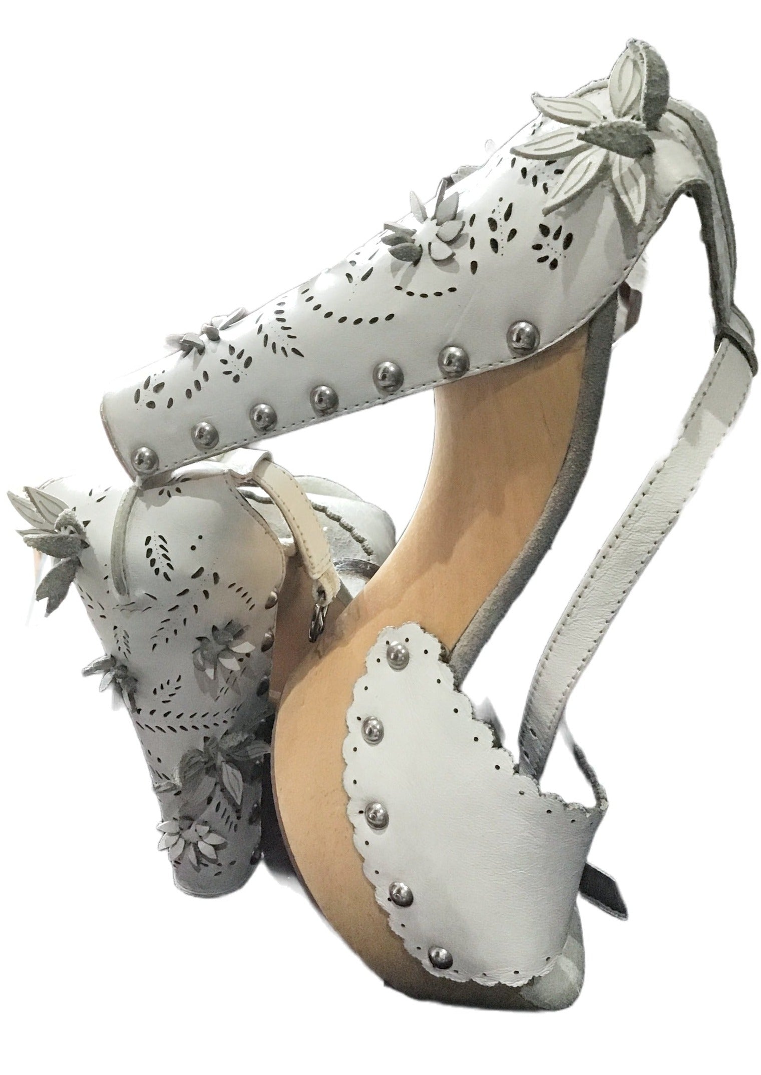 Fab 1940s style women's vintage 90s Schuh white leather high heel clogs sandals in a white cut work leather.. Thin ankle strap with the vamp and heel leather attached with chrome studs. The heel has cutwork floral leather which attaches to the ankle strap.