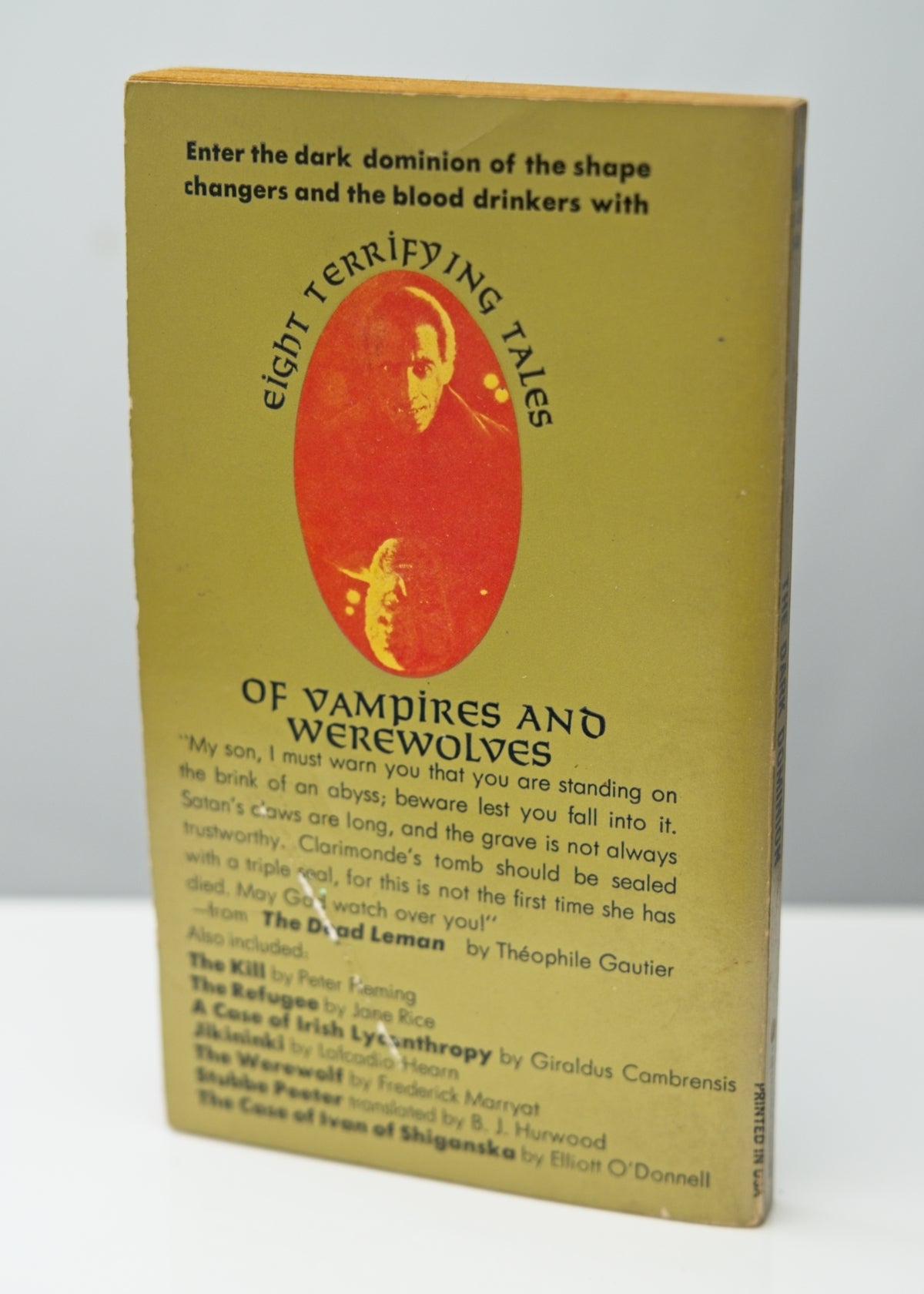 Eight terrifying tales of vampires, werewolves and demons by Peter Fleming, Jane Rice, Giraldus Cambrensis, Théophile Gautier, Lafcadio Hearn, Fredderick Marryat, B. J. Hurwood, Elliot O'Donnell.