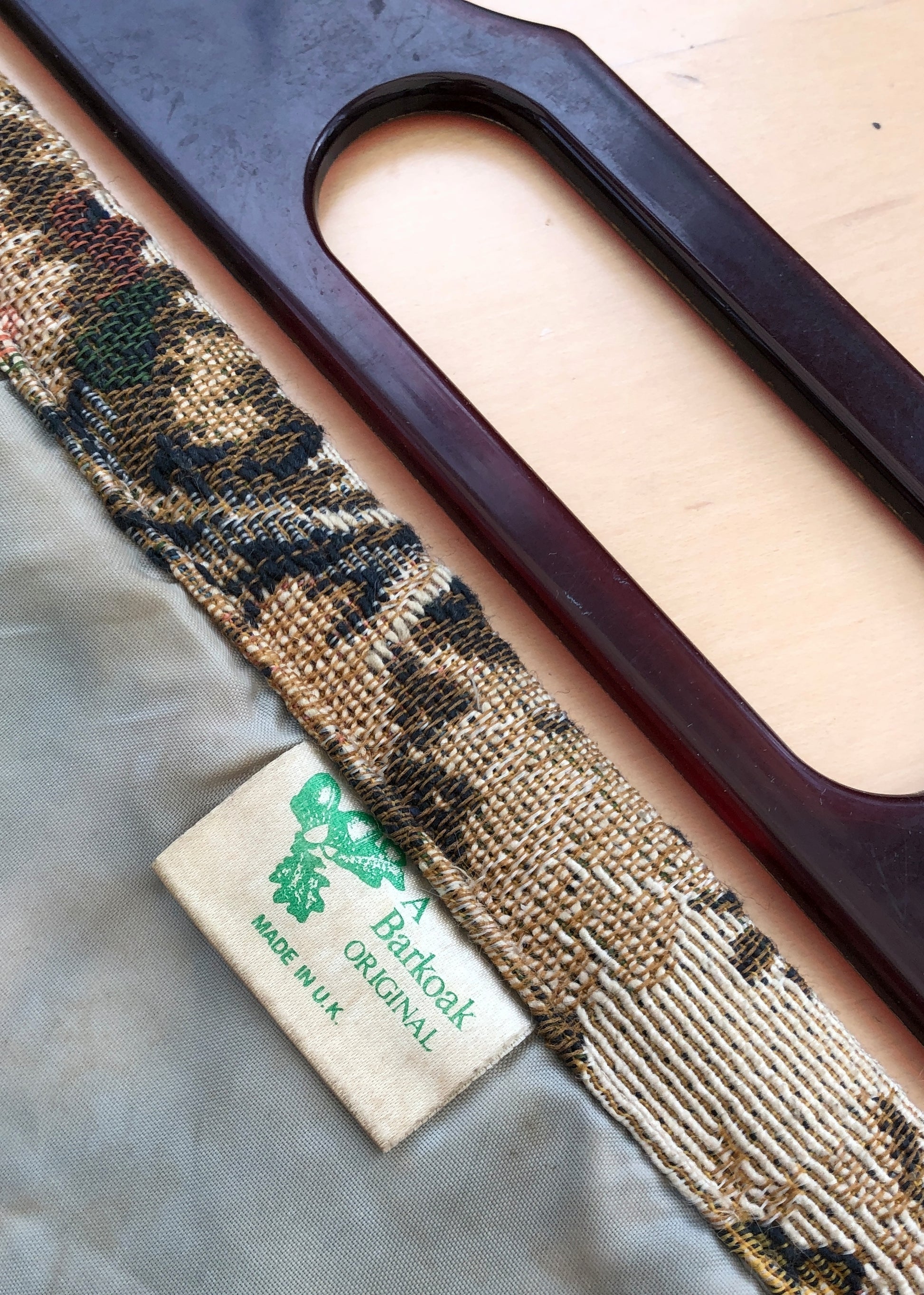 Fab 1960s/70s vintage work bag, knitting bag made from a tapestry fabric featuring people in Georgian costume amongst trees. It has brown lucite plastic handles. This is a lovely deep bag and strong, great for keeping your knitting or sewing craft projects in, or you could also use for gathering your daily groceries.