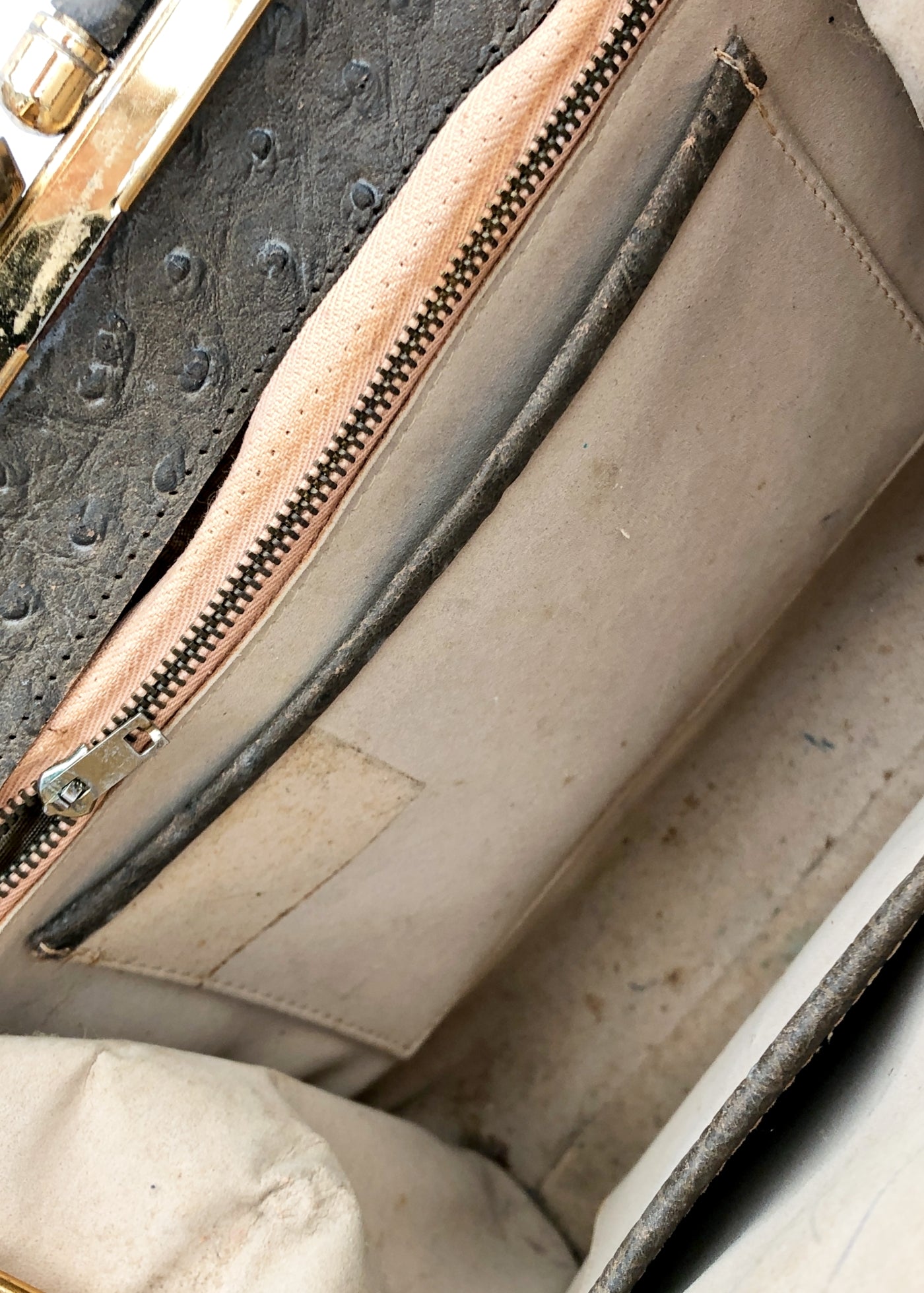 A Vintage 50s brown ostrich leather Kelly Bag made by Bagcraft of London. With gold-tone metal frame and a clasp. The interior is beige suede with two inside pockets and a zipped compartment. Two top handle straps. This bag is well worn and a bit shabby, the zipped compartment is coming away from the lining, the leather is very rubbed and worn.