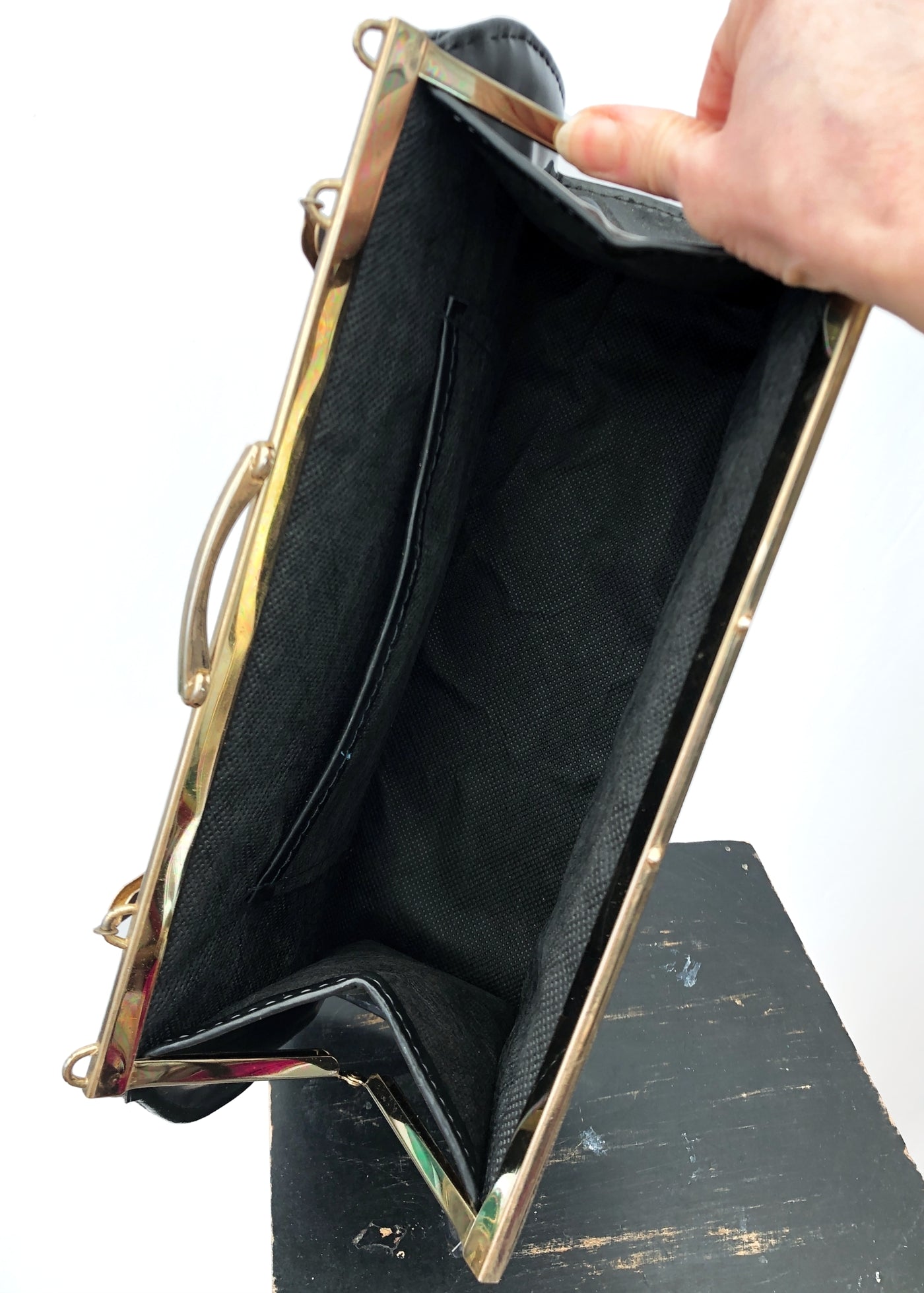 This vintage 60s black vinyl, mock-croc handbag has a fabulous long structured shape with a brass metal handle. I have to say it is one of my favourite bags. It almost has a look of a vintage doctor's bag to it. The outer is shiny patent vinyl with a faux croc panel on the front with gold tone metal hardware, frame and clasp. The interior is black fabric with a single side pocket. There are loops on the frame to attach a shoulder strap, but it is missing its original strap, so you'll need to source one if yo wish to wear it as such.