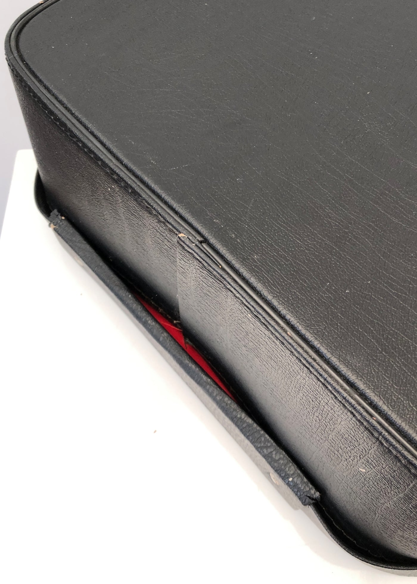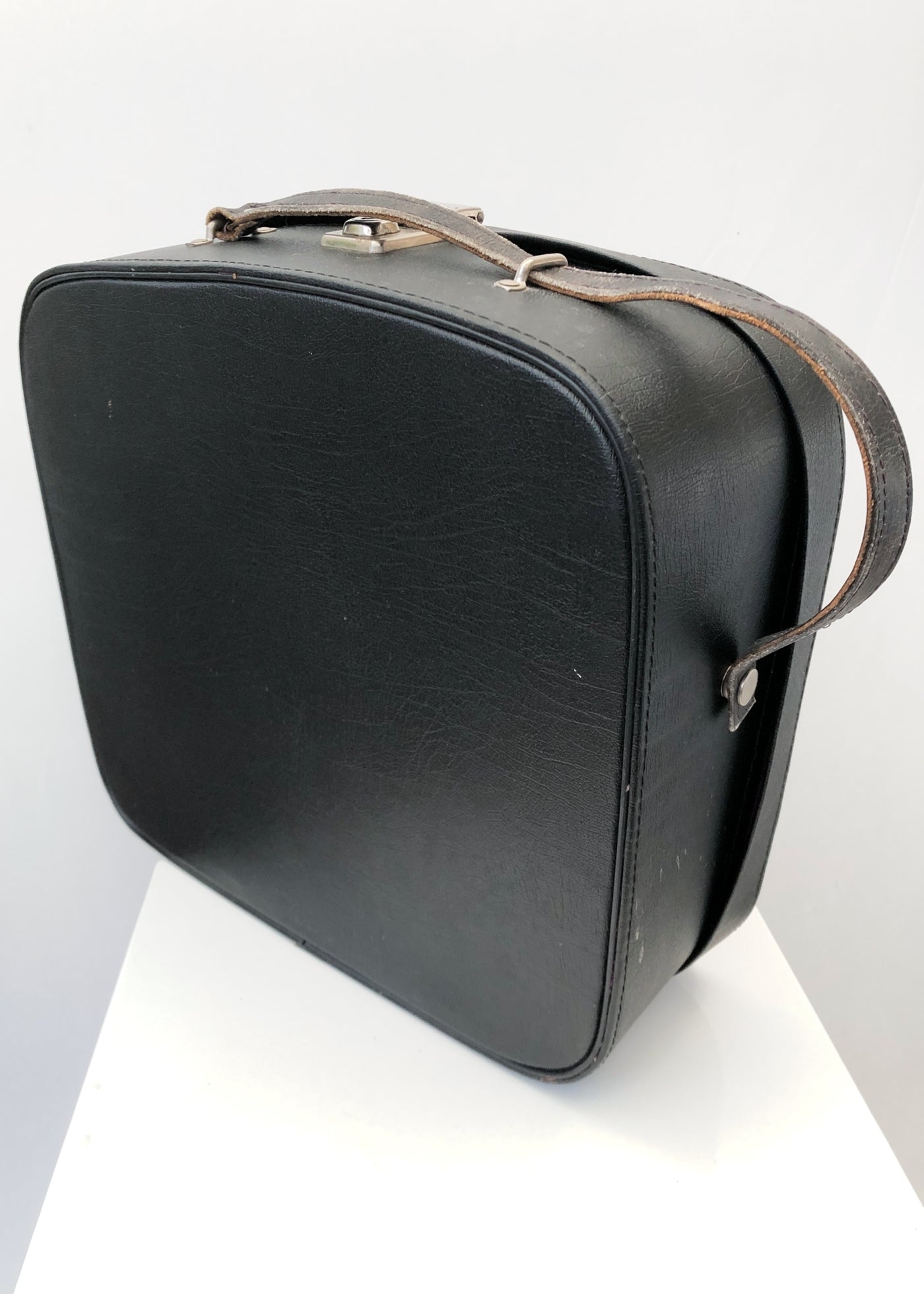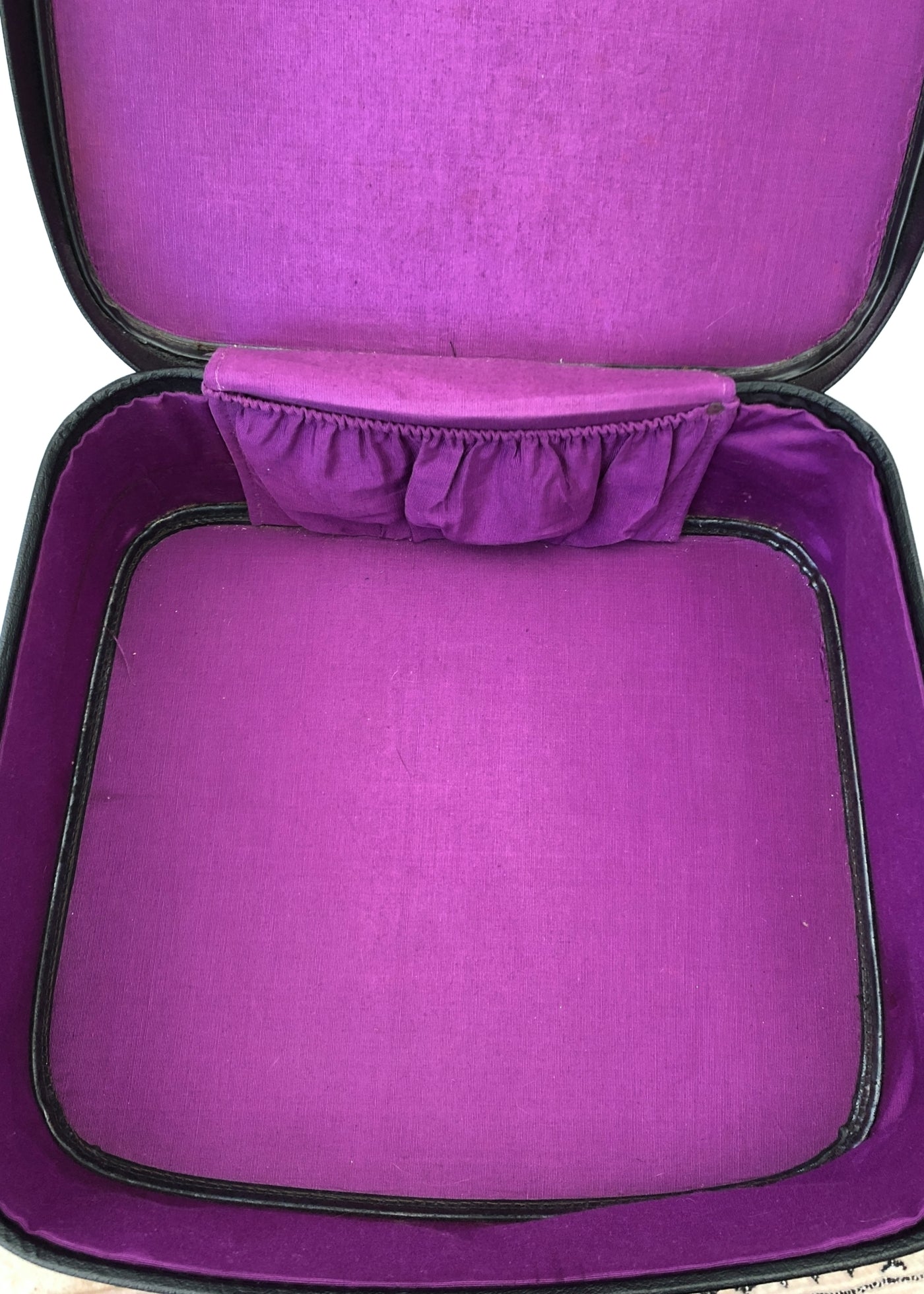 Vintage 60s black leather vanity case with purple lining. These are perfect travel cases for your carry on luggage, with plenty of room for all your cosmetics and potions, and weekend packing.