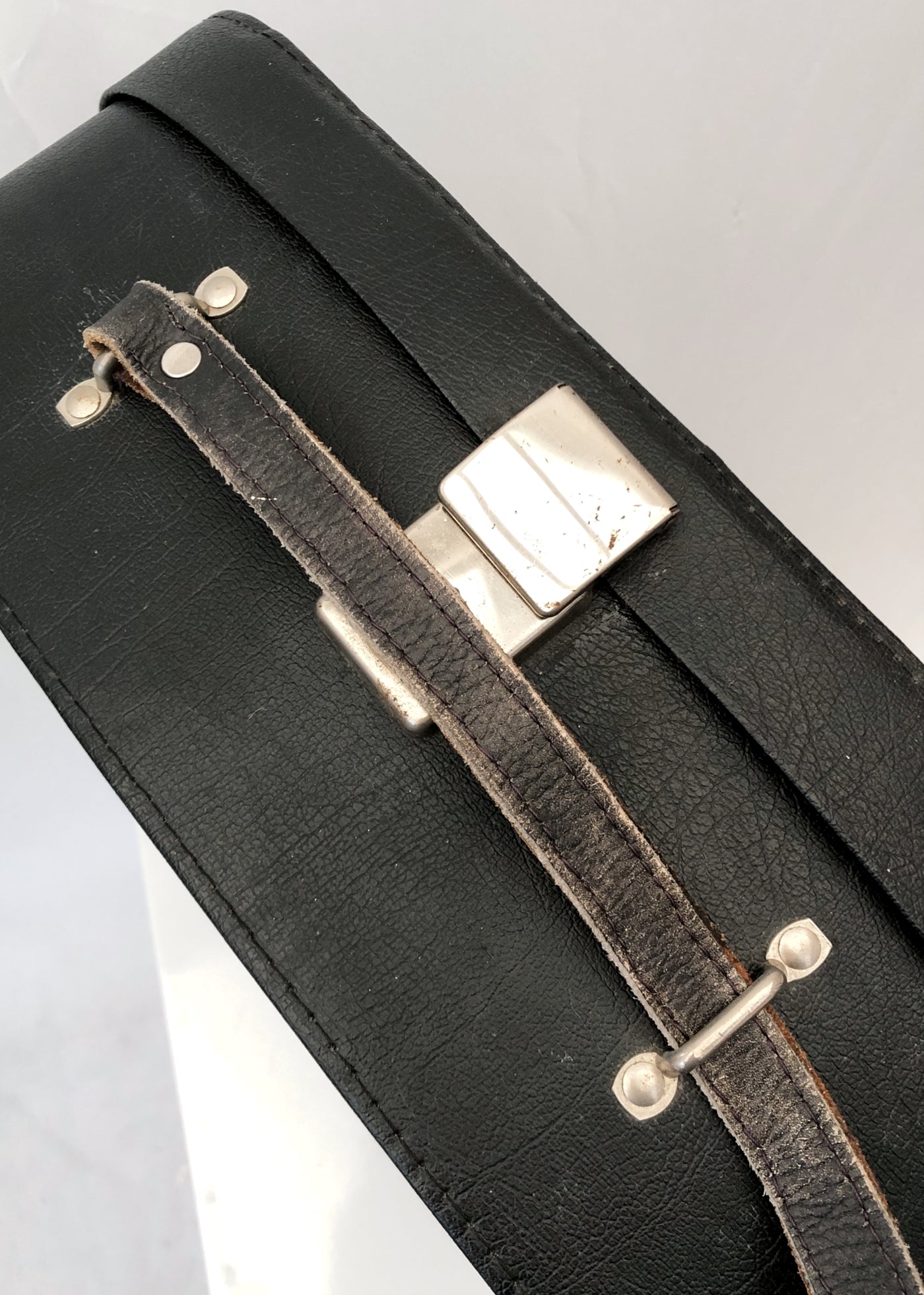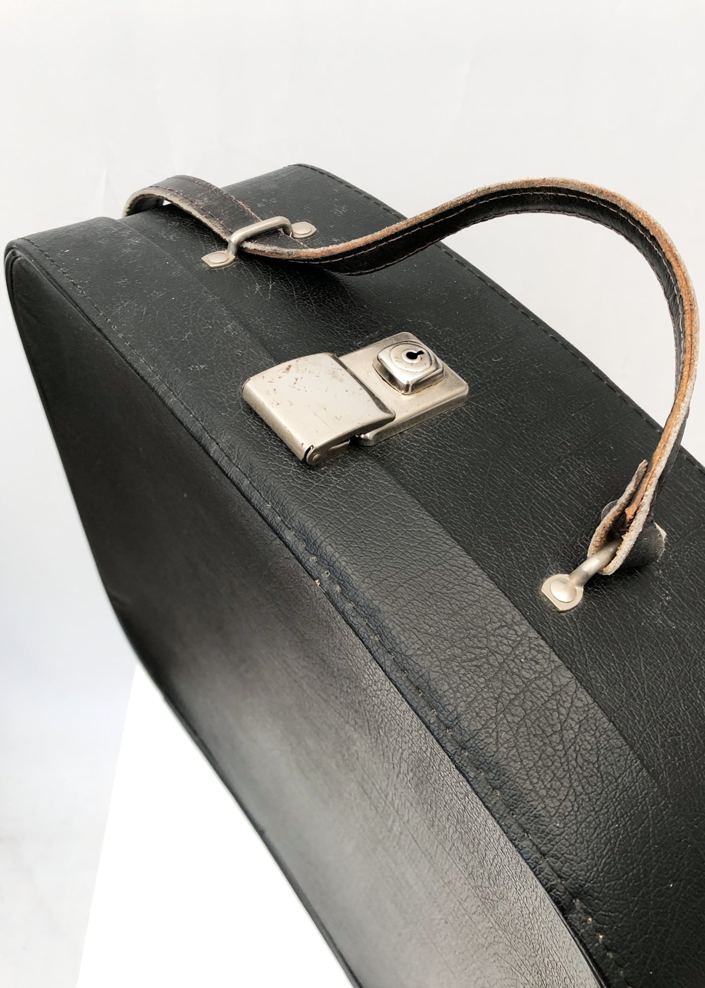 Condition - good, the lining has been profesionally relined at some point from the original red lining, you can just see a little glimmer of red at the base, see all images. The leather strap is nicely worn and softened. There is not a key for the lock.