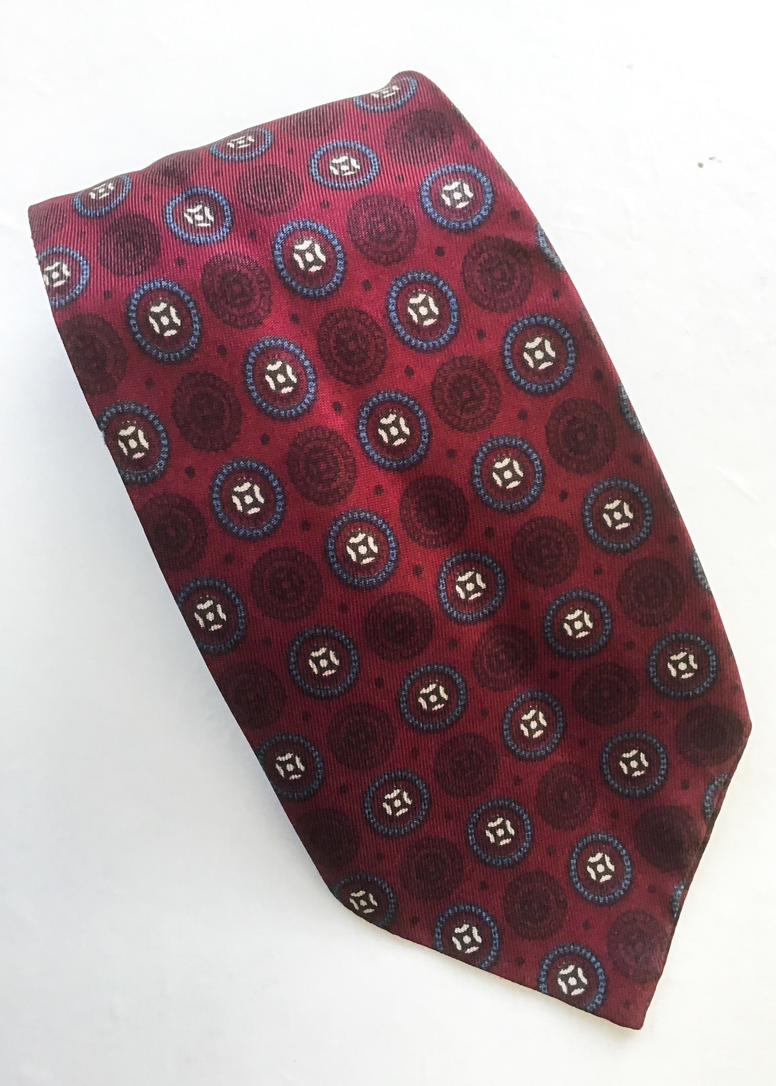 Fabulous maroon/burgundy neck tie with a blue and white circles pattern set onto a burgundy background, the fabric feels like a tricel.