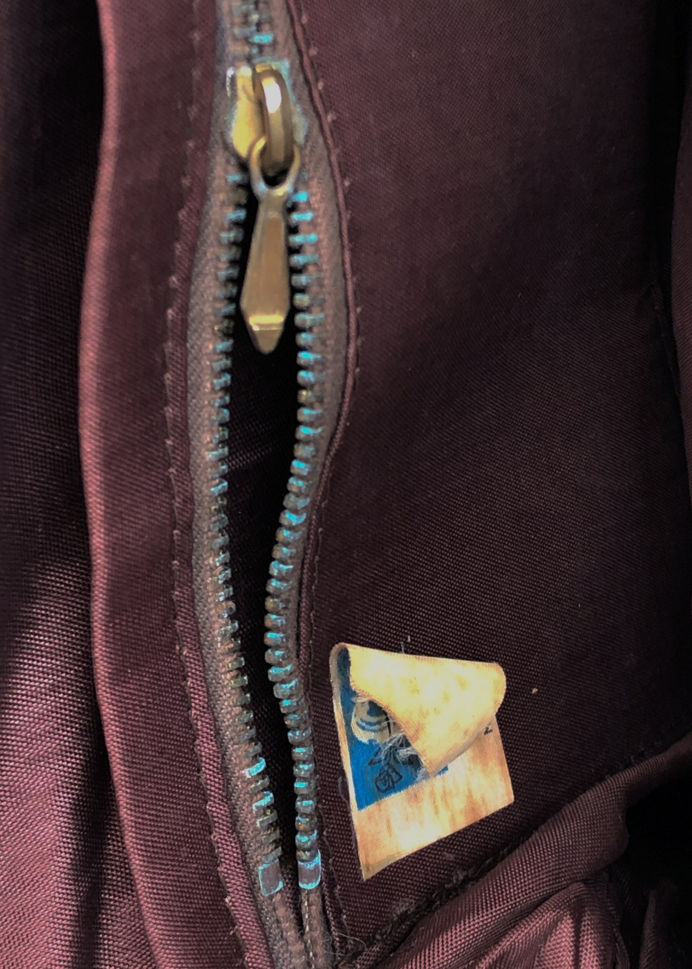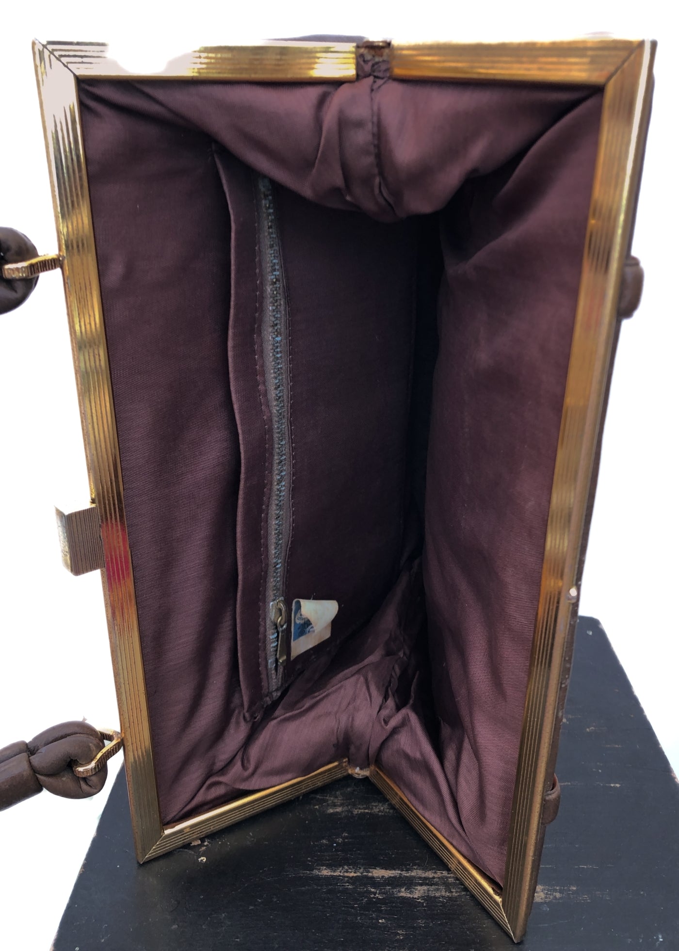It's in ok condition, there's a few white paint marks around the base as shown in photos and the lining is a bit shabby. The zipper on inner compartment is verdigis stained, although it does still work.