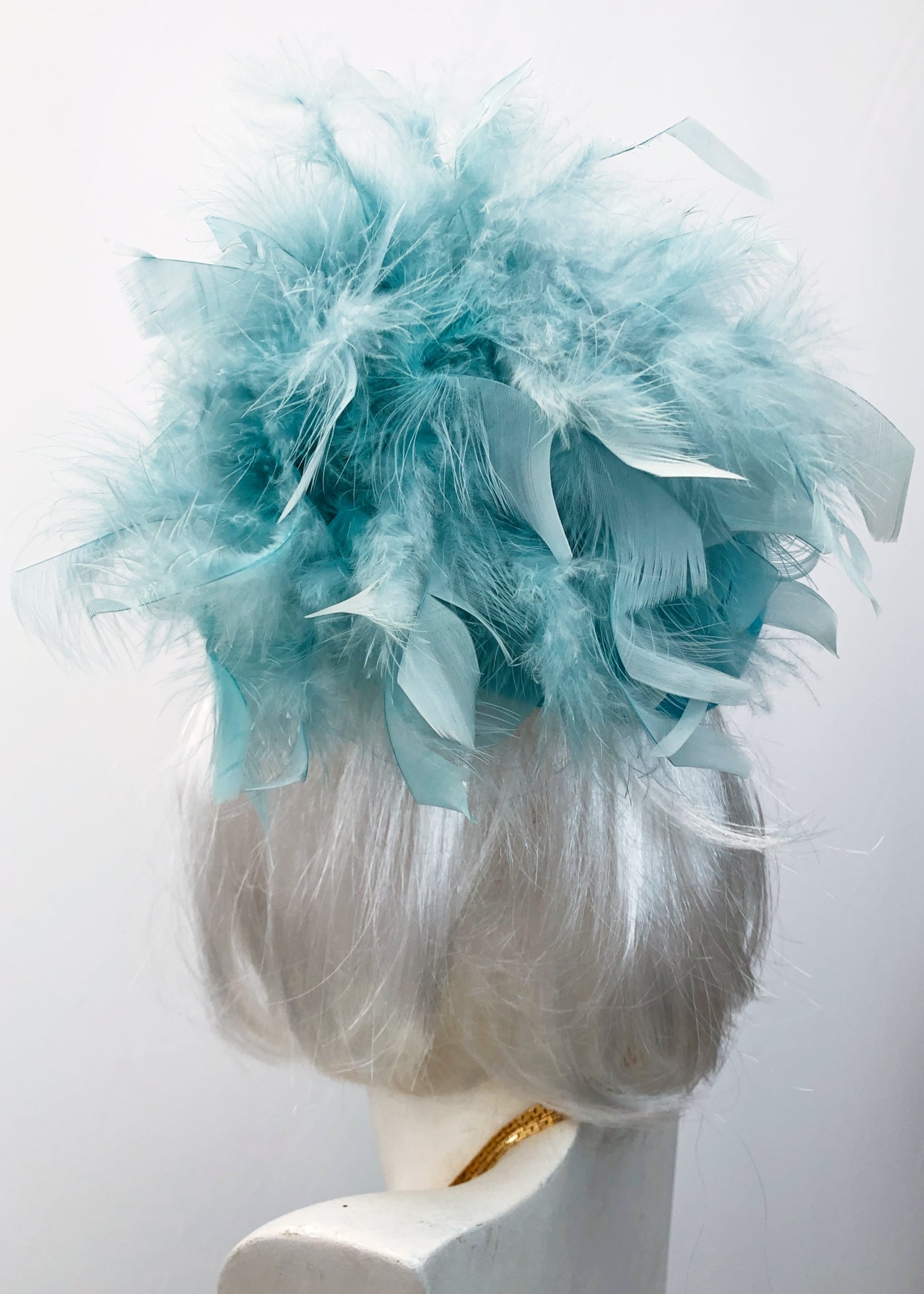 • Floppy pale turquoise boa type feathers attached to one side