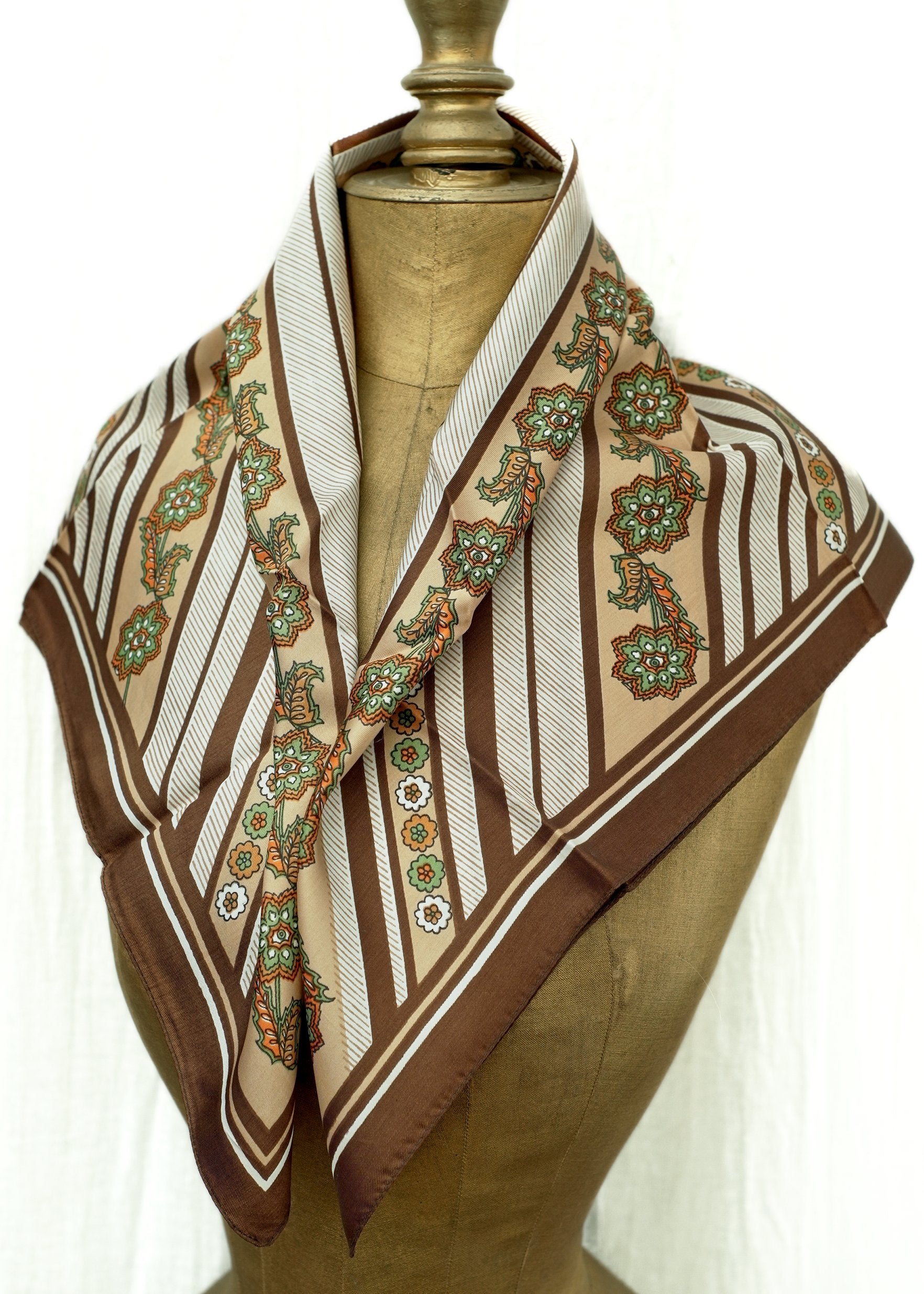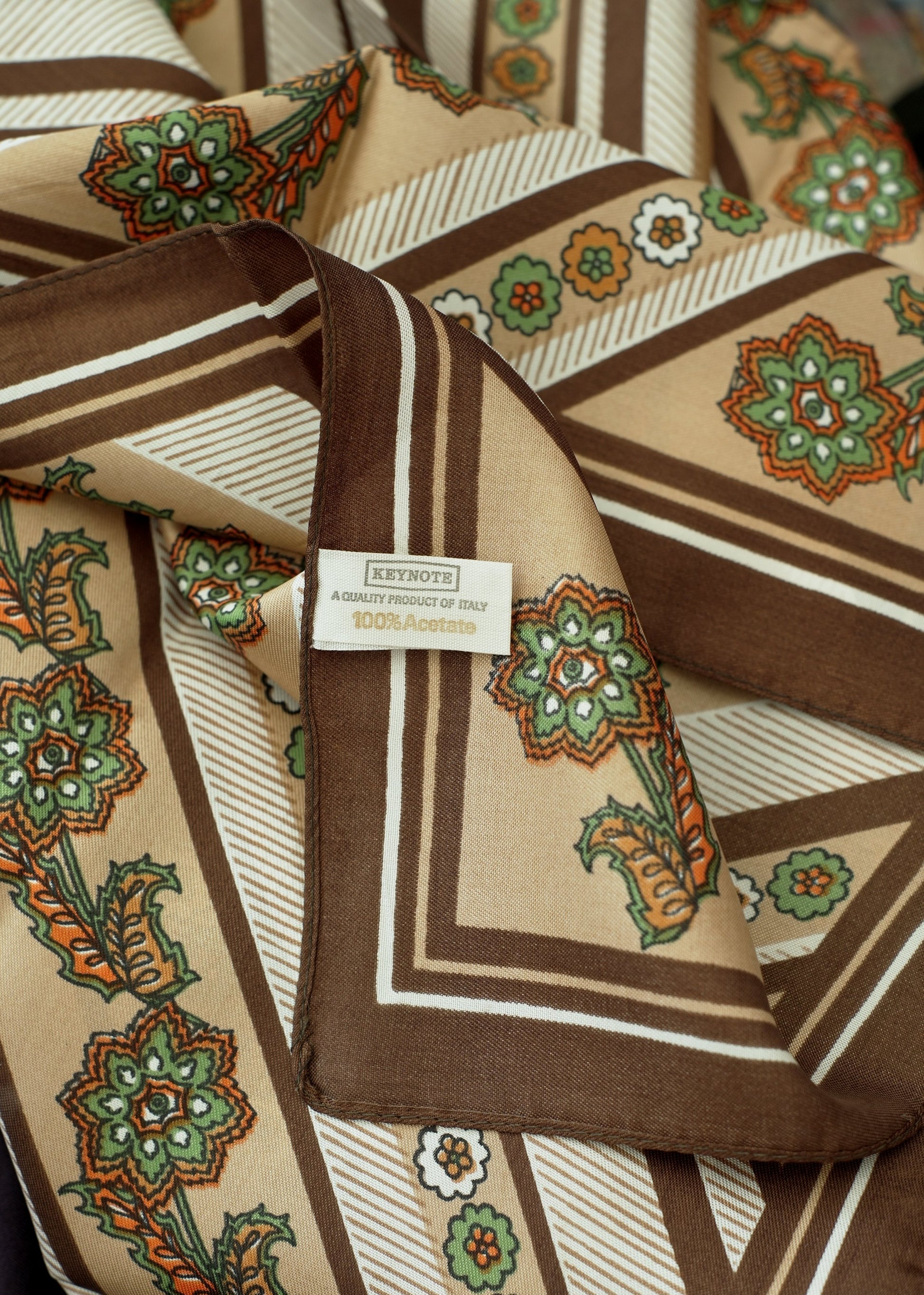 Vintage Brown and Green Flower Keynote Head Scarf • Made in Italy