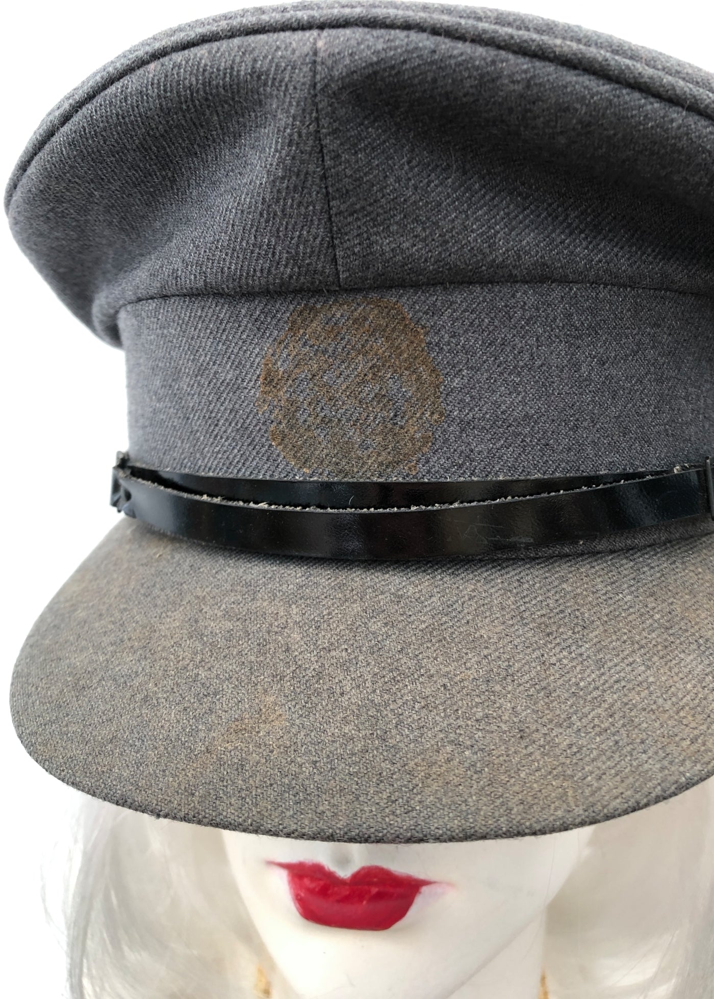 A classic blue/grey cloth chauffers peaked cap, with a blacl vinyl strap. As you can see it has a glue mark where an emblem badge must have been stuck on the front. The peak is age discoloured slightly but as a costume piece it is ok. Perfect for theatrical or fancy dress.