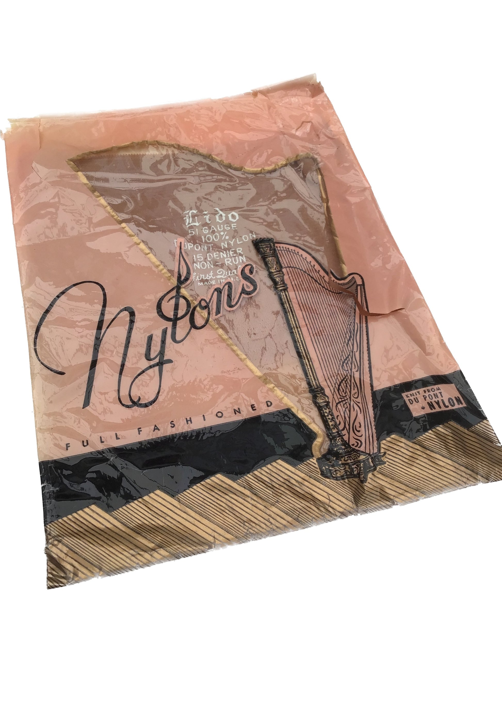 Vintage 50s deadstck 15 denier Dupont nylon stockings by Lido in original unopened packaging, with a fabulous packaging of a harp.