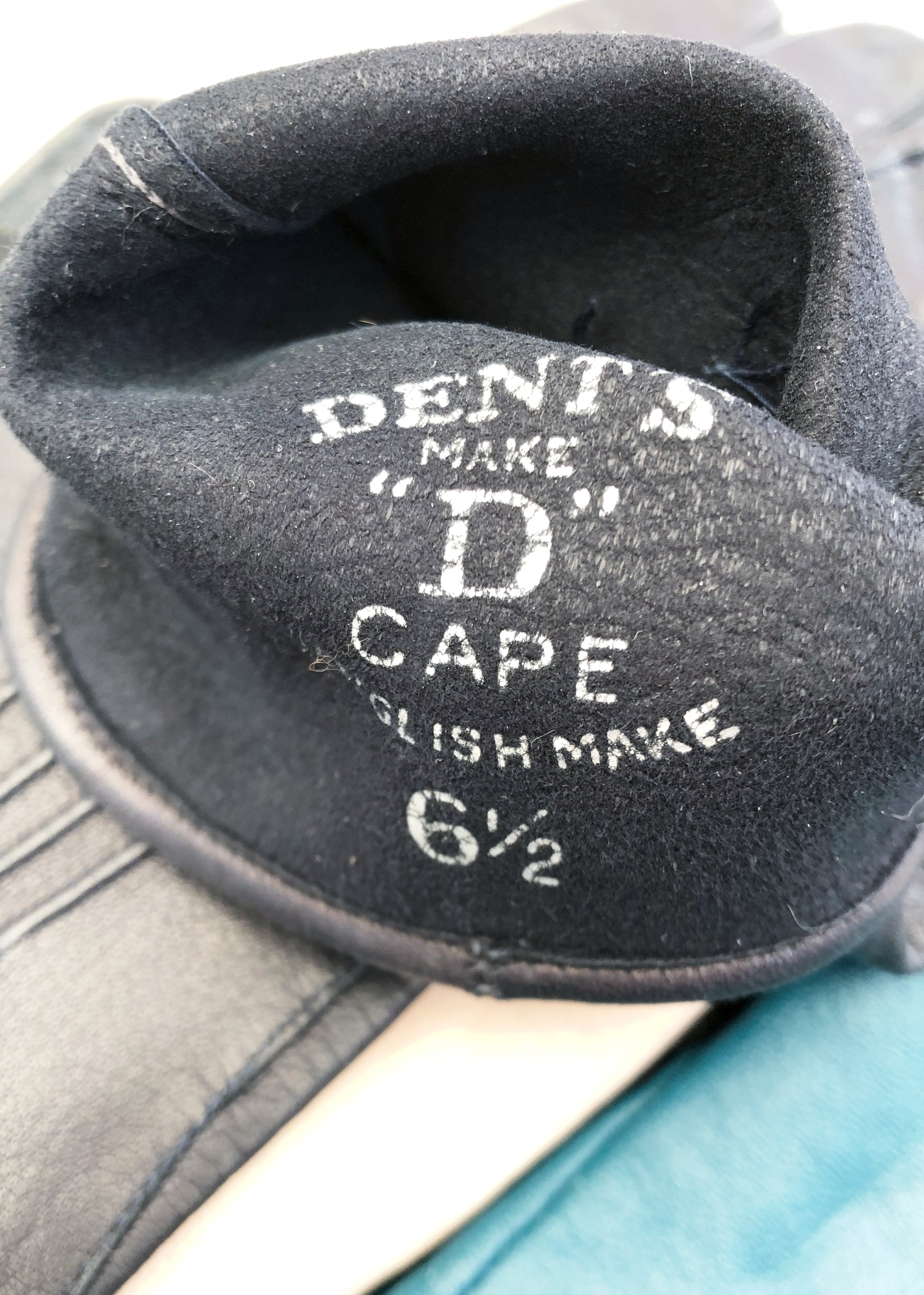 Beautifully women's vintage 70s-80s soft kid leather wrist length gloves. Dents 'D' Cape gloves in midnight blue, almost black. They cover just over the wrists, have stitching detail on the uppers and the gauntlet shape curves away at the top.