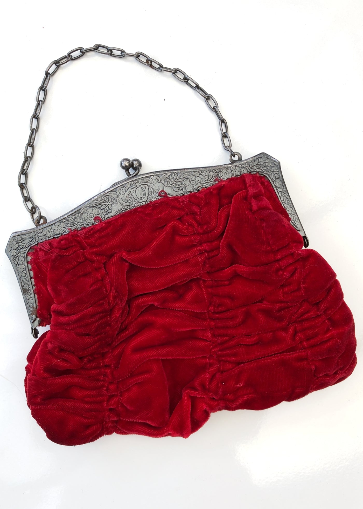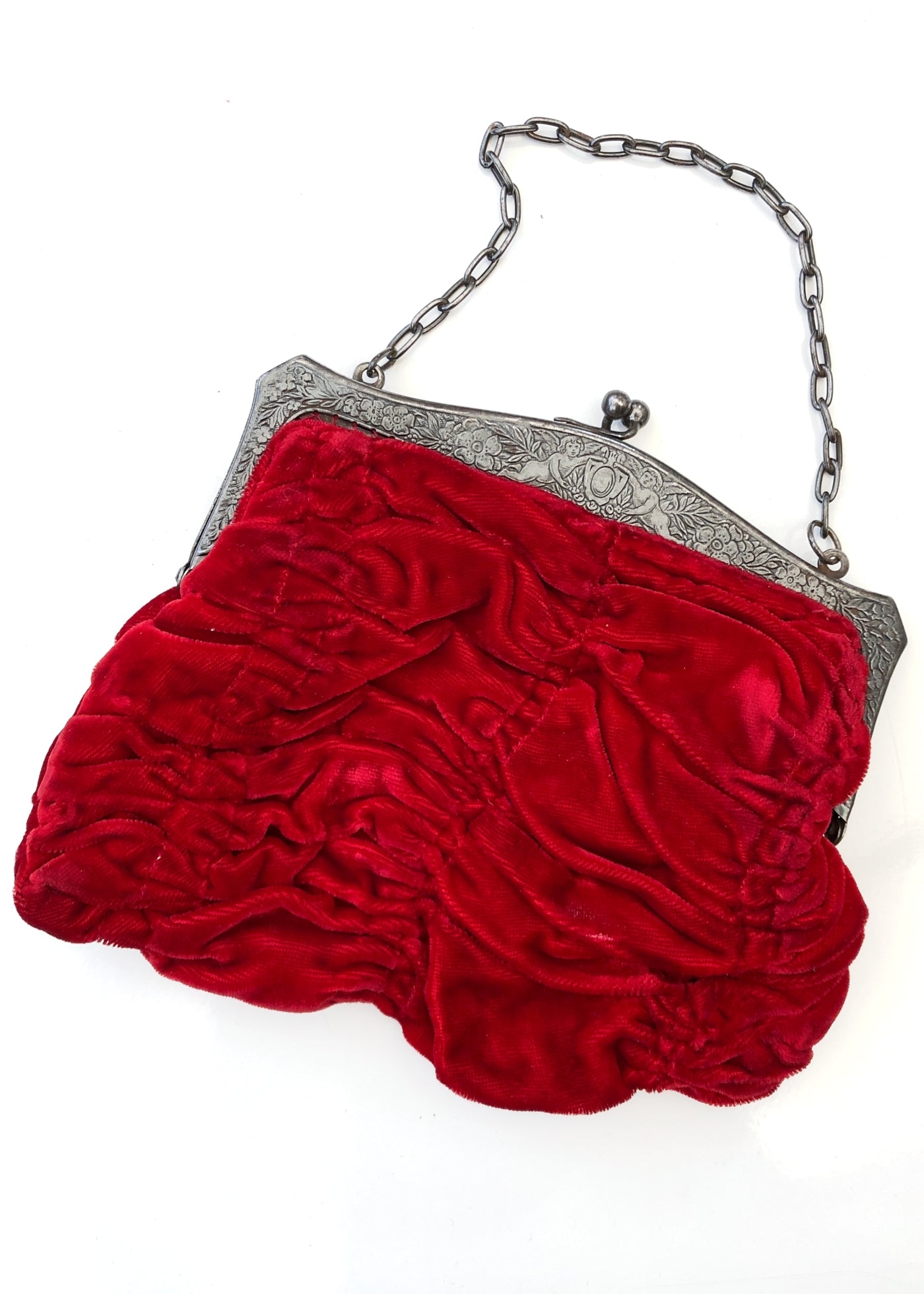This vintage Victorian style red velvet evening purse bag is deliciously gothic with the blood red coffin pleats, the aged grey pewter coloured metal frame is engraved with winged cherubim holding a shield. Chain handle to dangle fro your wrist.