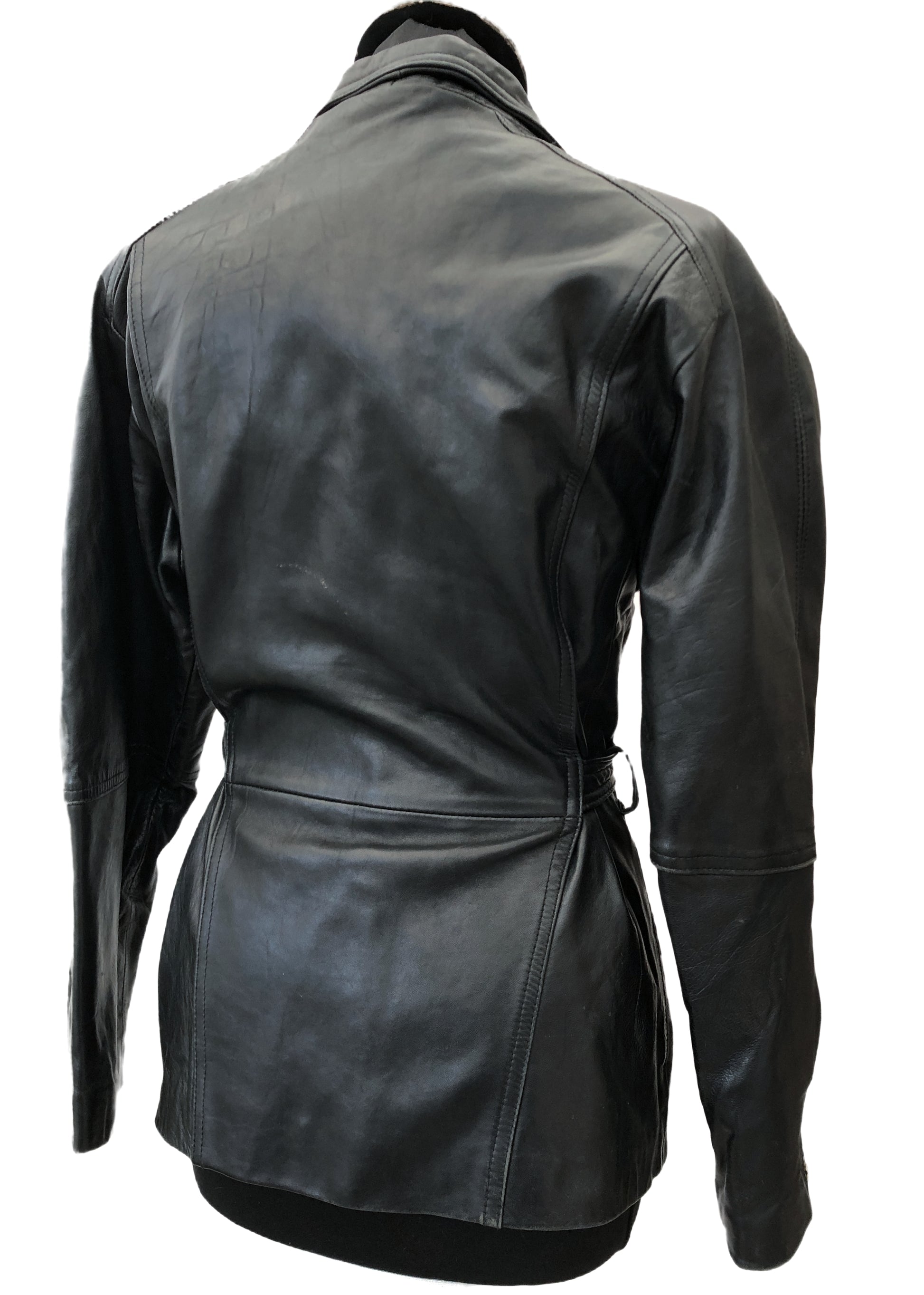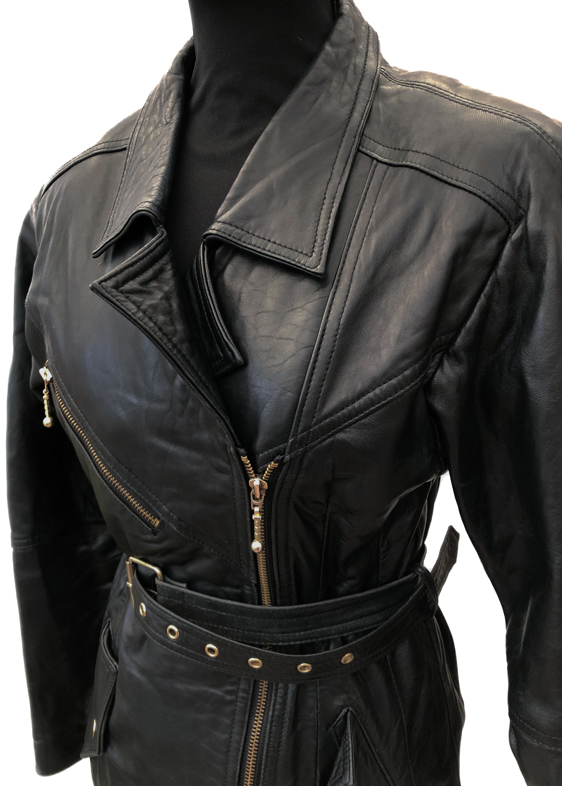 Super cool women's vintage 80s longline biker style leather jacket, in super soft black leather with a belt to cinch in the waist. Side zip fastening with a zipped breast pocket and side pockets with popper flaps. This is a wonderful jacket and the leather is super soft. I bought this from Melrose Ave in California decades ago and it cost a lot more back then.